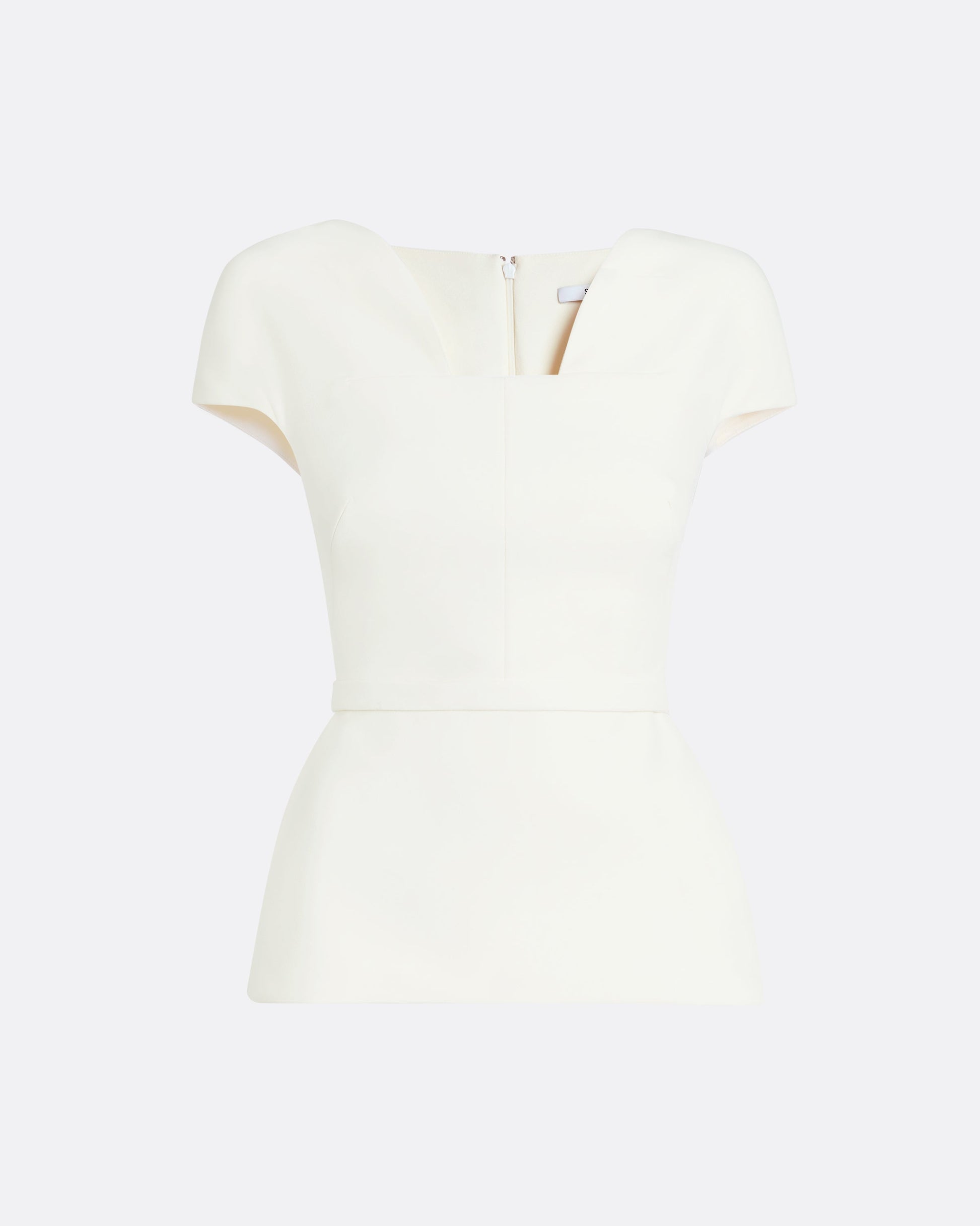 Peplum cocktail dress with sculpted neckline in ivory Heavy Crepe.