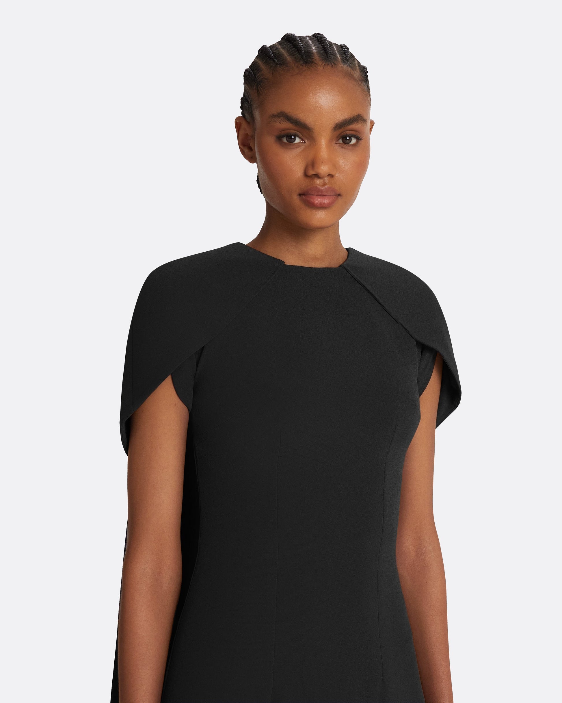 Full-length fitted short sleeve cape dress with a long tailed back with a deep split and covered buttons.