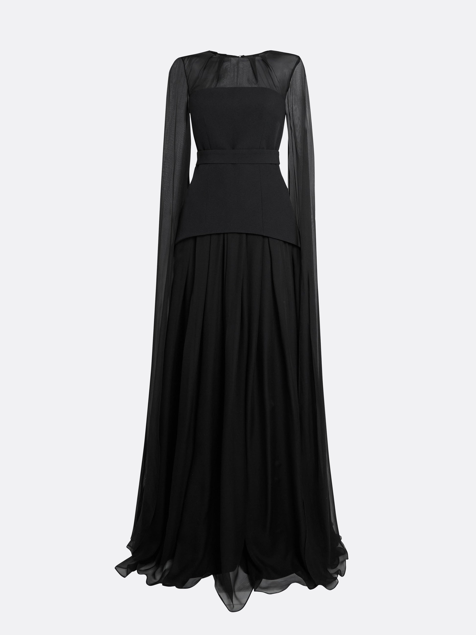 Draped round neck fluid gown with structured elongated bustier and caped sleeves in black.