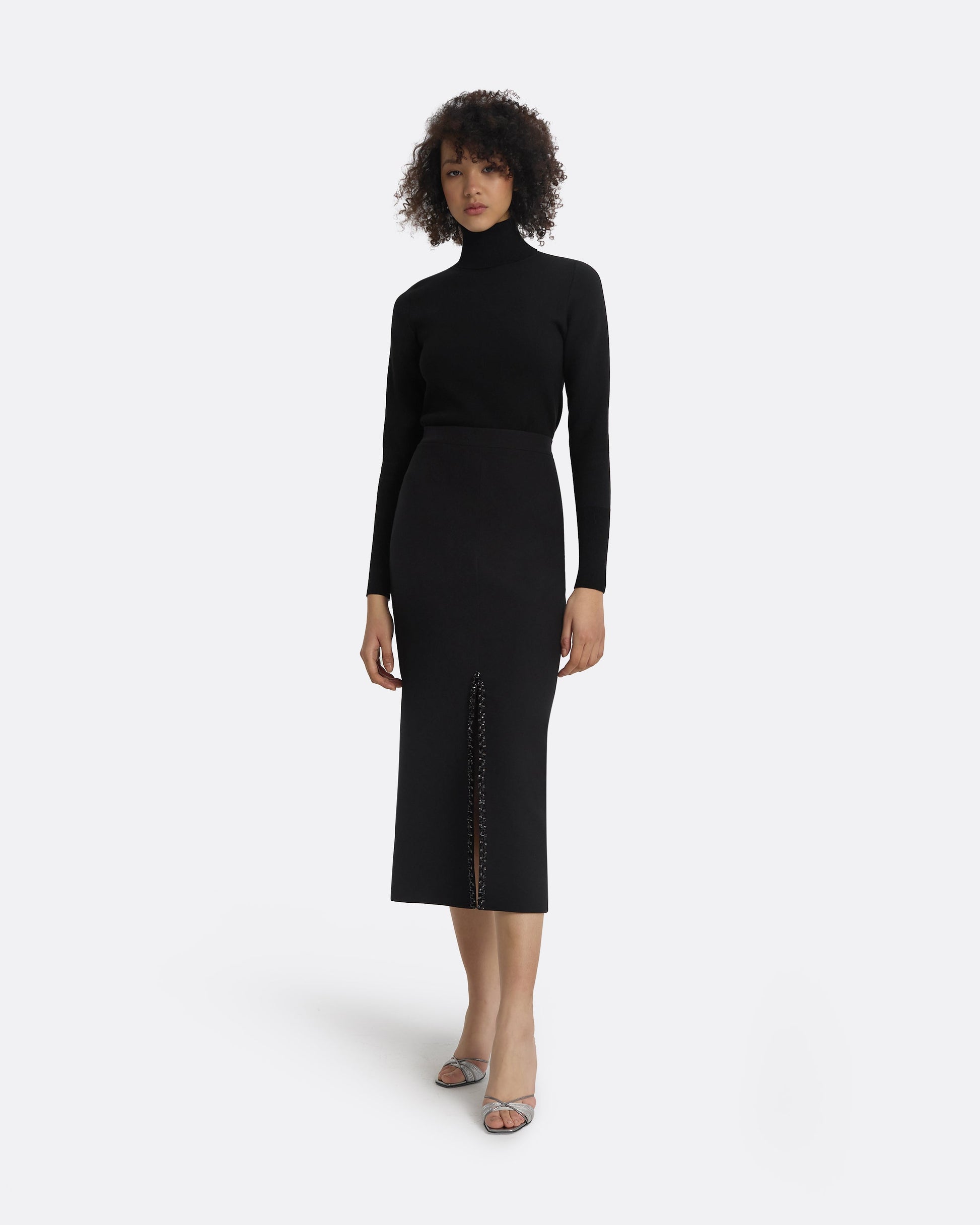 Ankle-length skirt with front and back centre slit in black Heavy Crepe with black Nuit Trim embroidery.
