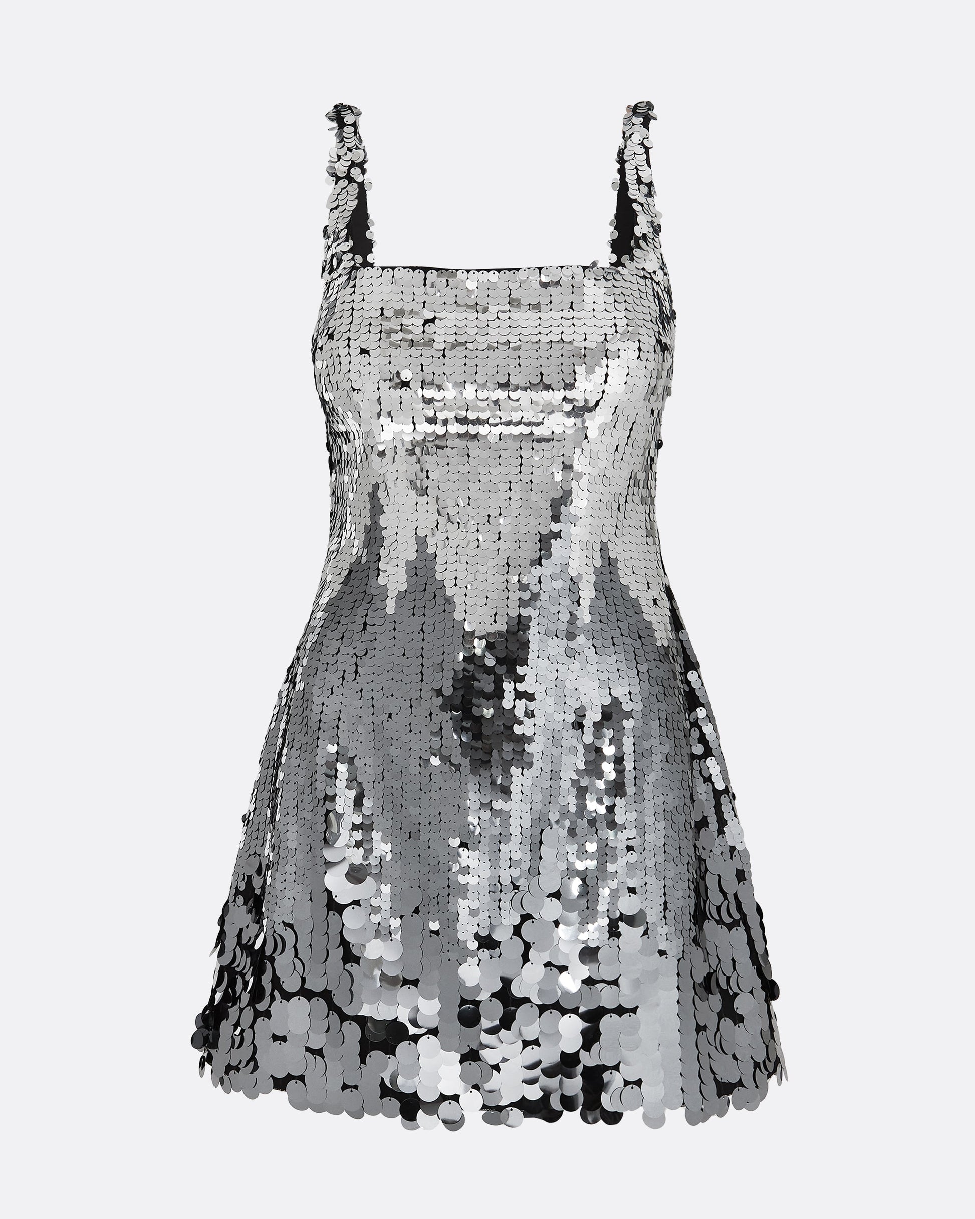 A-line mini dress with square neckline in gunmetal Aviation Sequin.