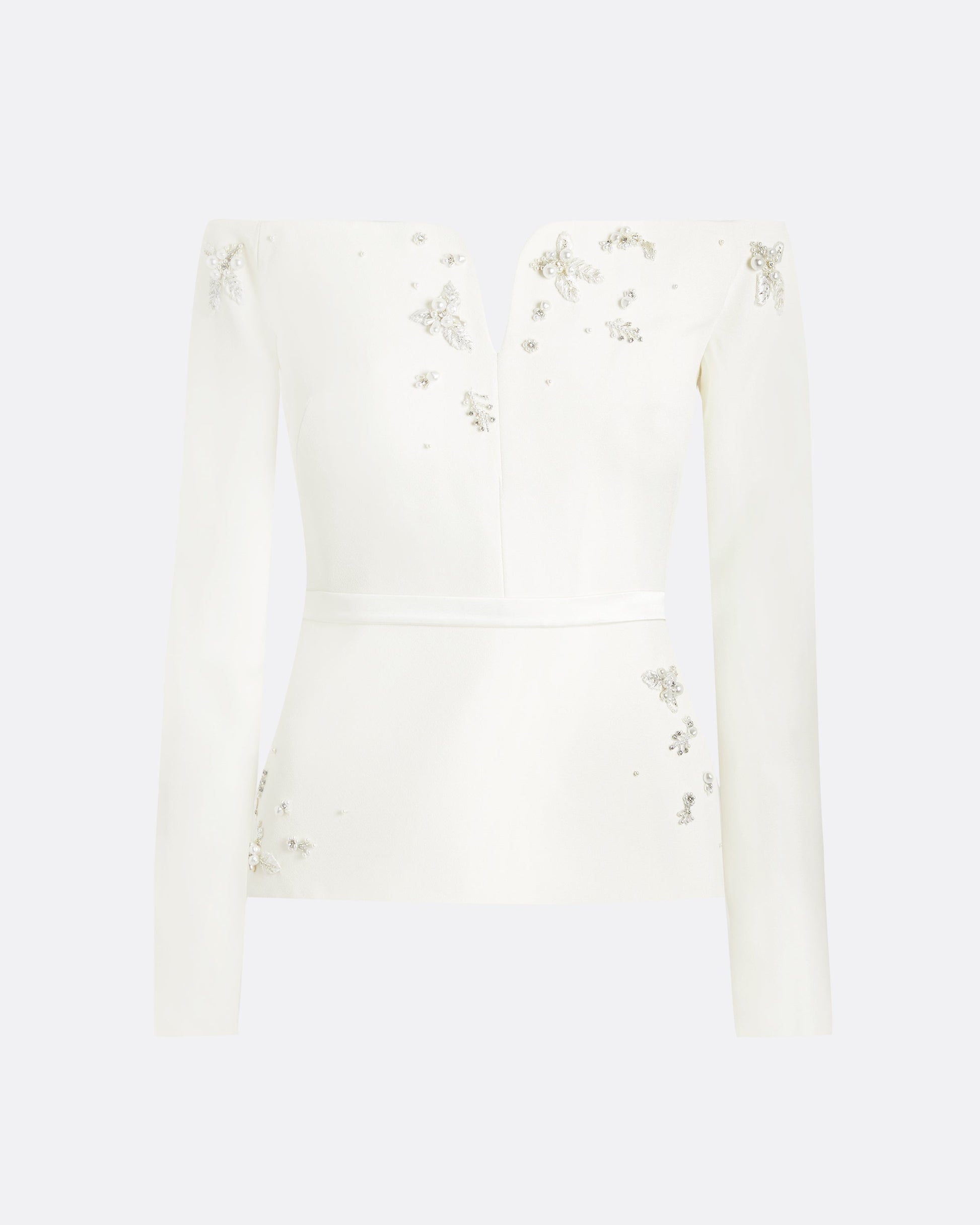 Long sleeve top with off the shoulder sculptured neckline in ivory Heavy Crepeand Pearl Floral embroidery.
