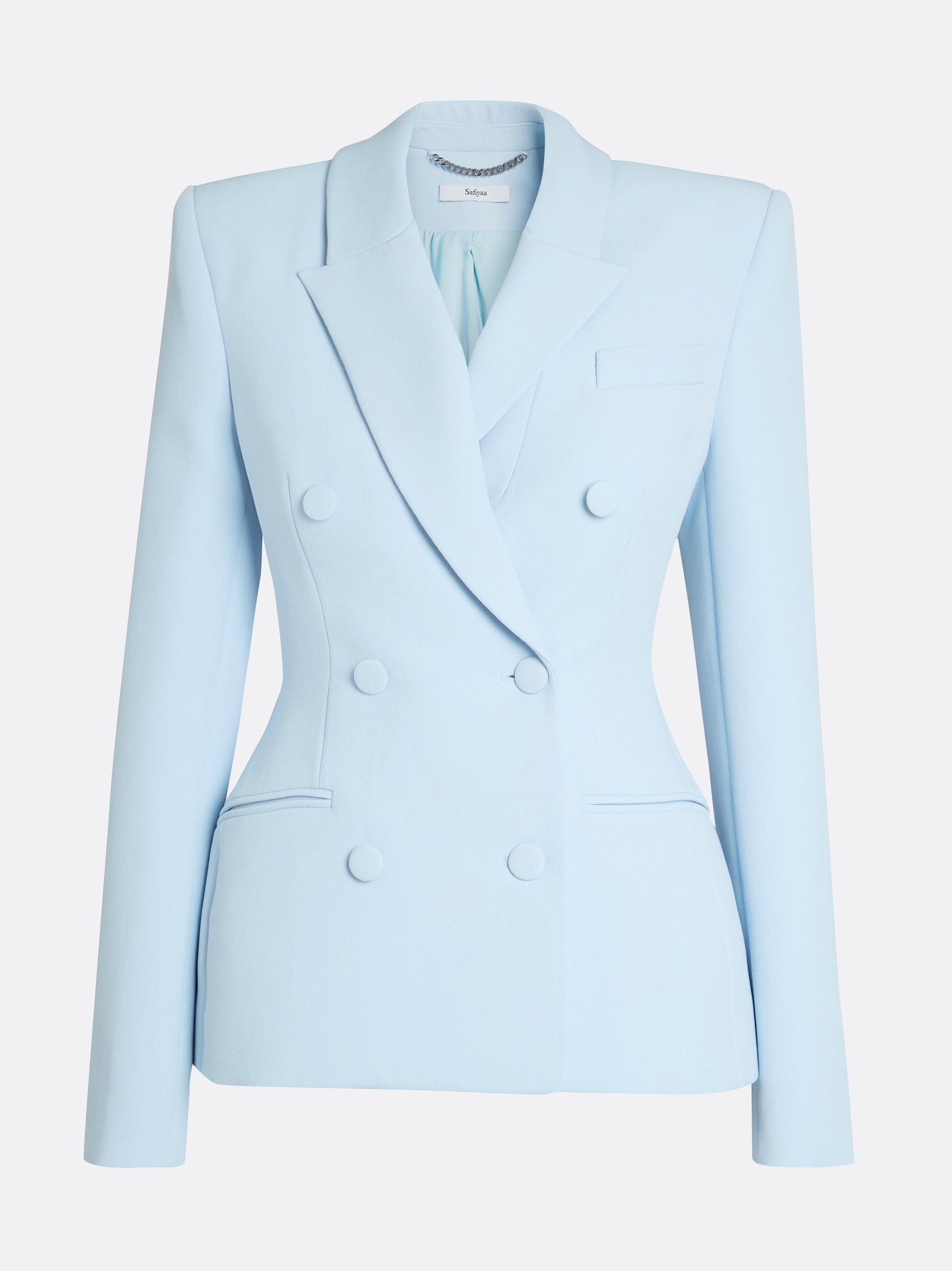 Wide shouldered, double breasted blazer in pale blue Heavy Crepe.