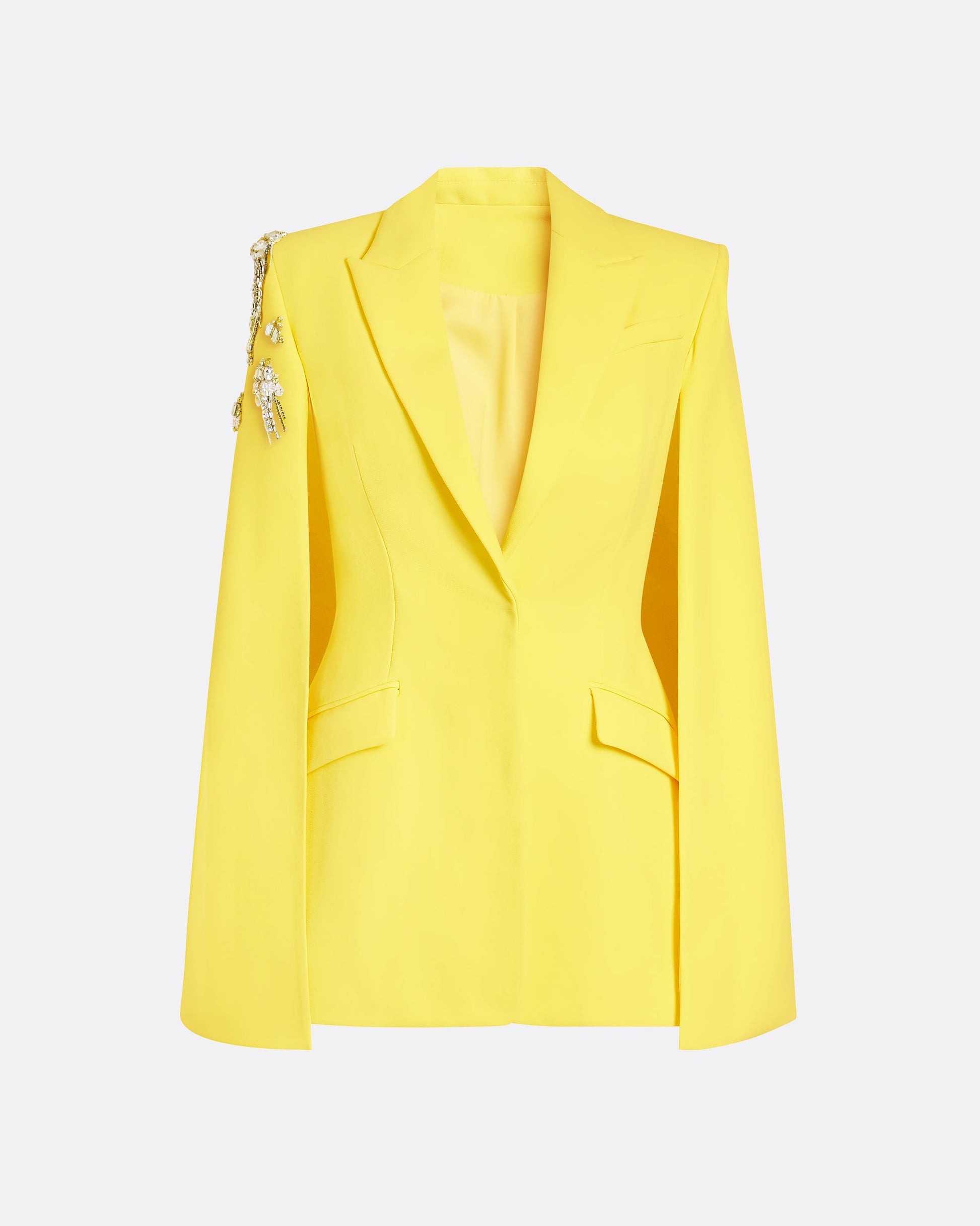 Caped, single breasted, tailored jacket in buttercup Heavy Crepe and citrine Orion Motif embroidery.