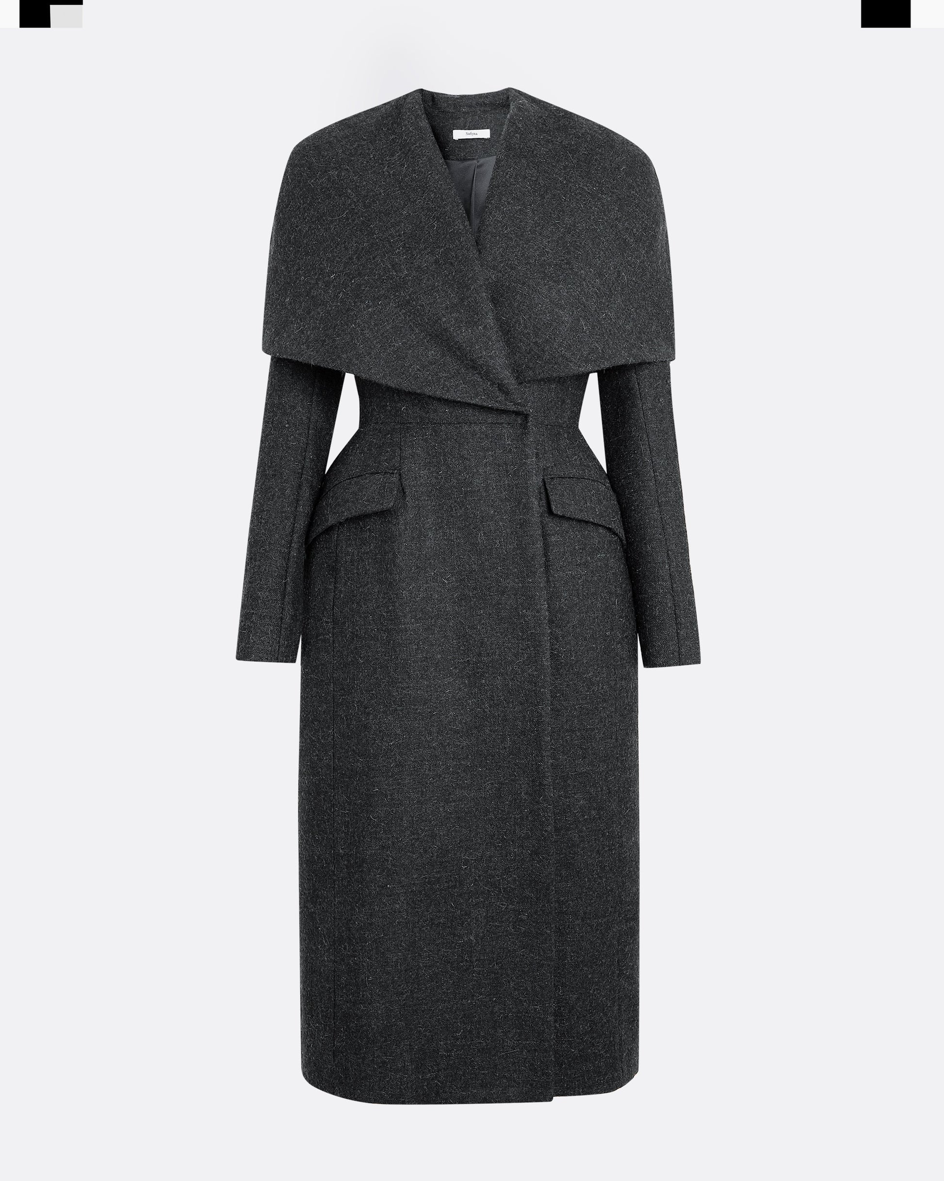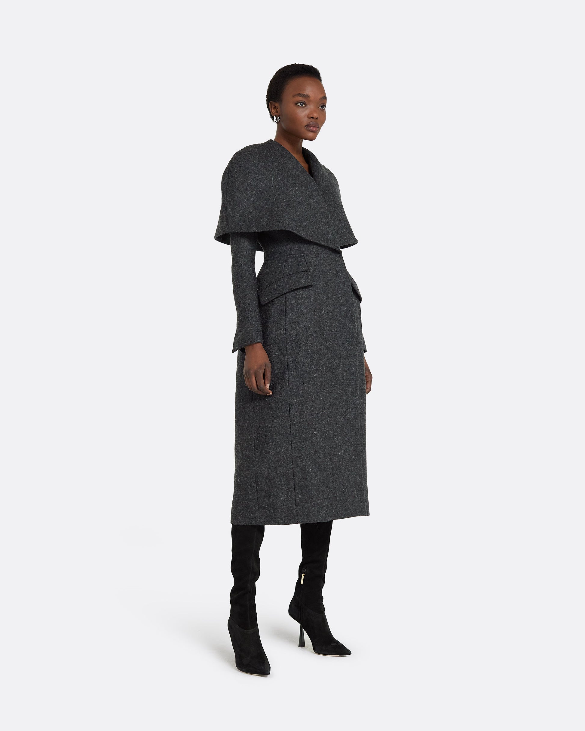 Tailored coat with structured caped top in speckled grey.