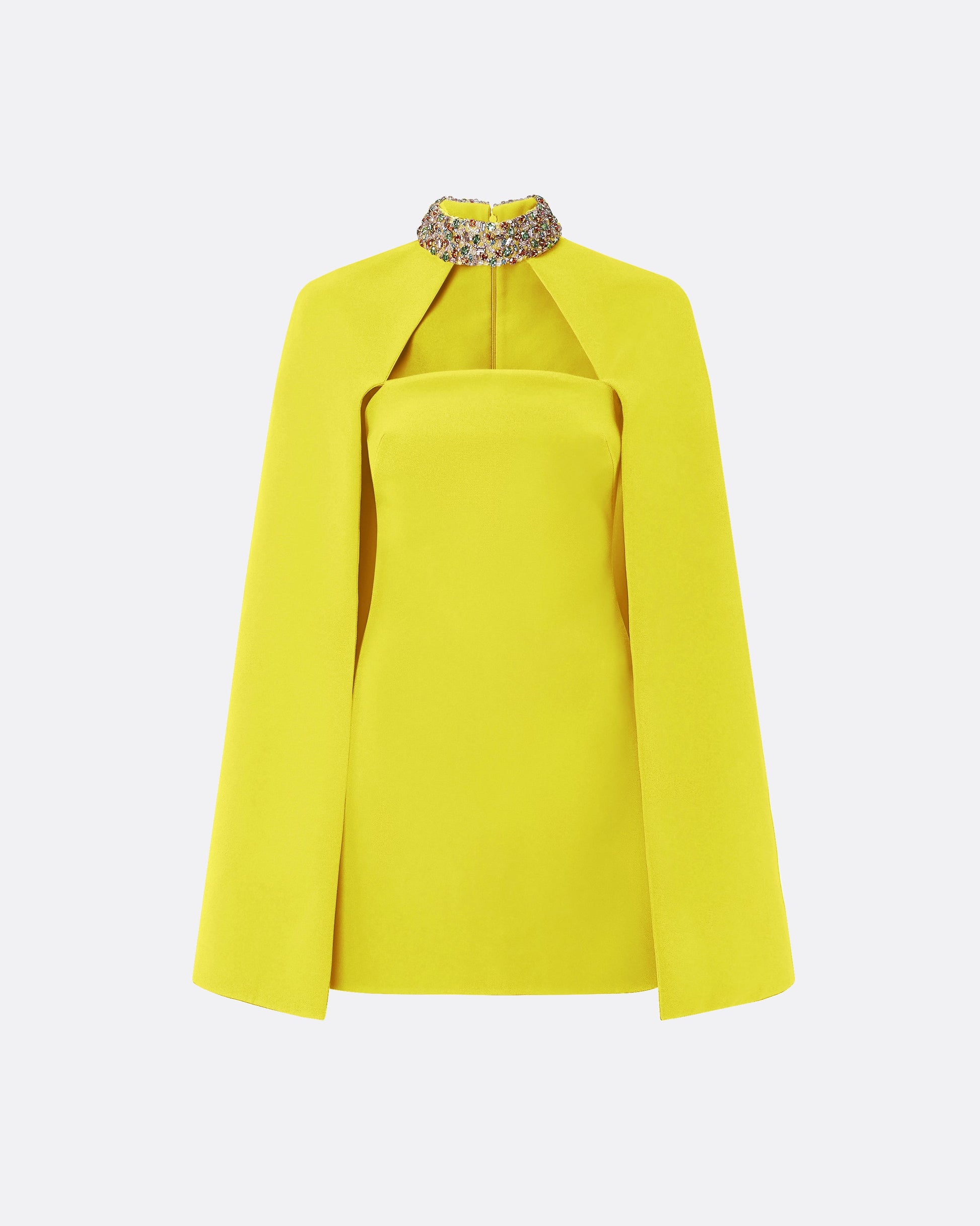 Mini, high neck, A-line dress with open sleeve in chartreuse Heavy Crepe with multi-brights Serra Trim embroidery.