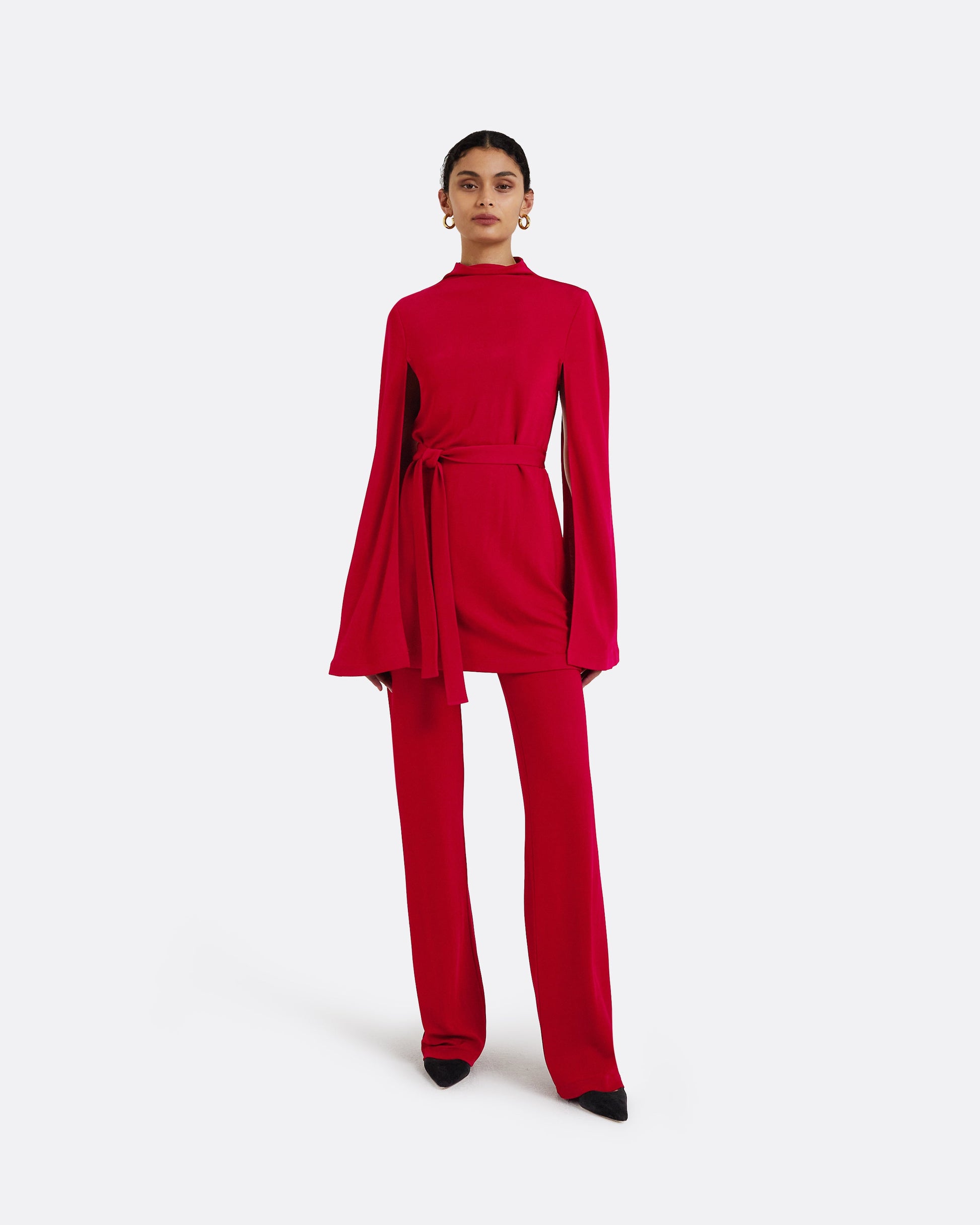 Draped neck top with caped back and sleeve detail and belt in ruby Fiona Jersey.
