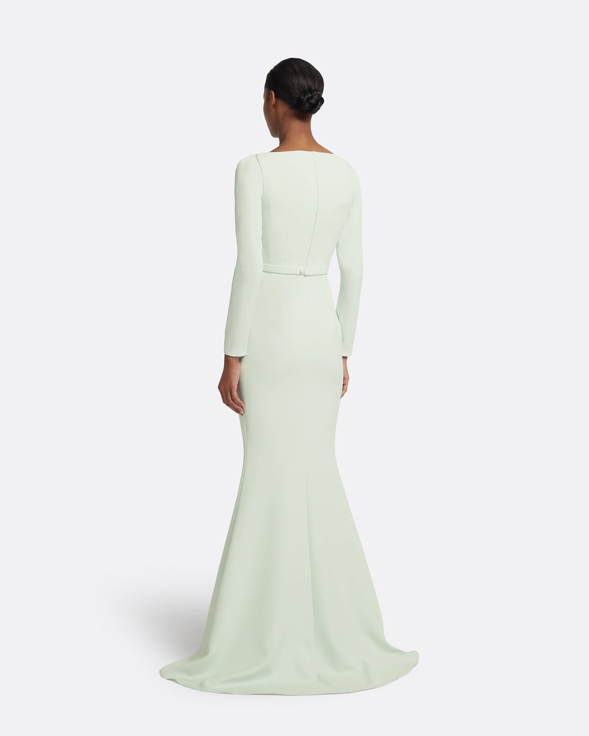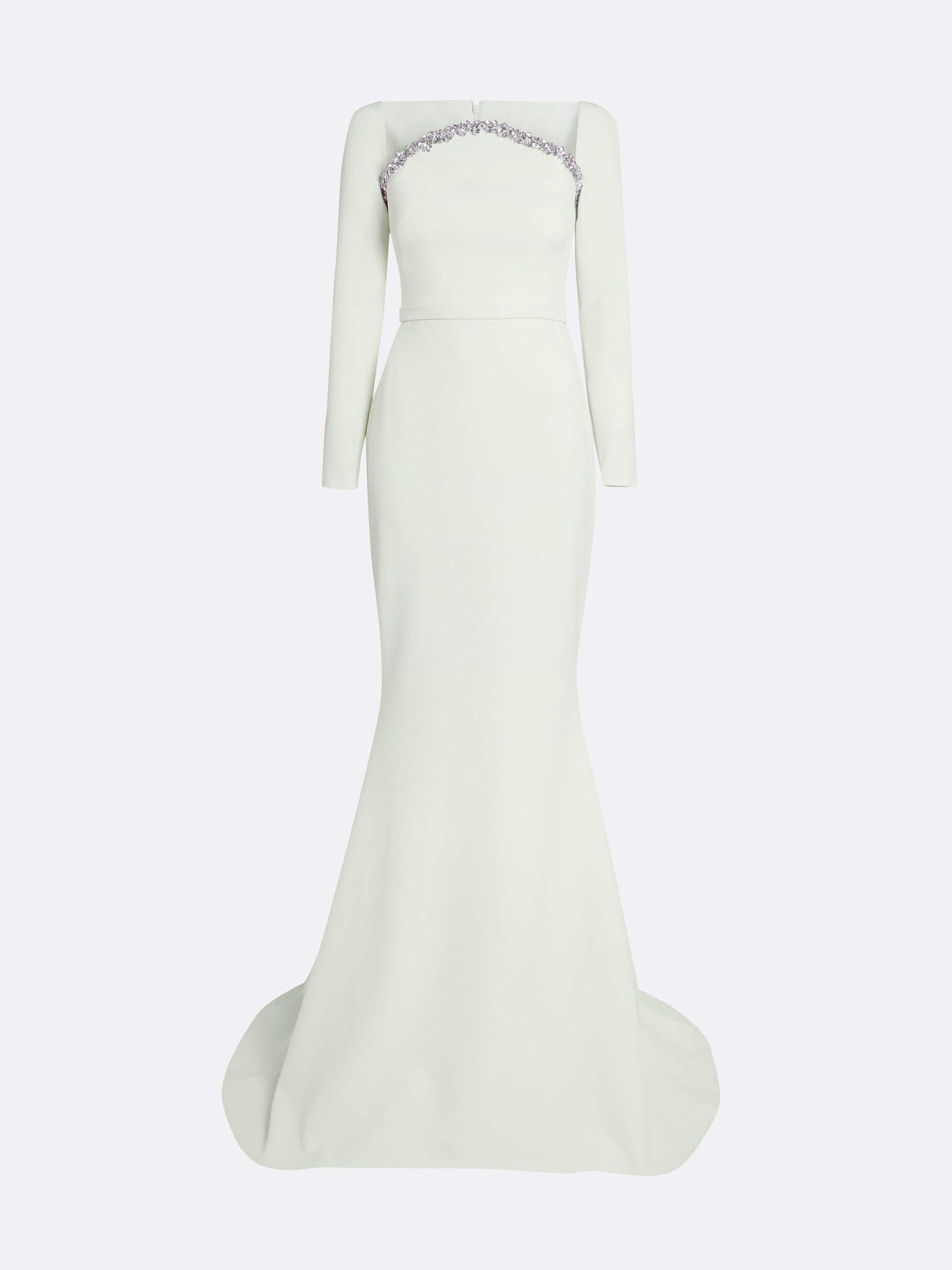 Floor length gown with fishtail skirt and rounded neckline in spearmint Heavy Crepe with smoke/Crystal Trim embroidery.
