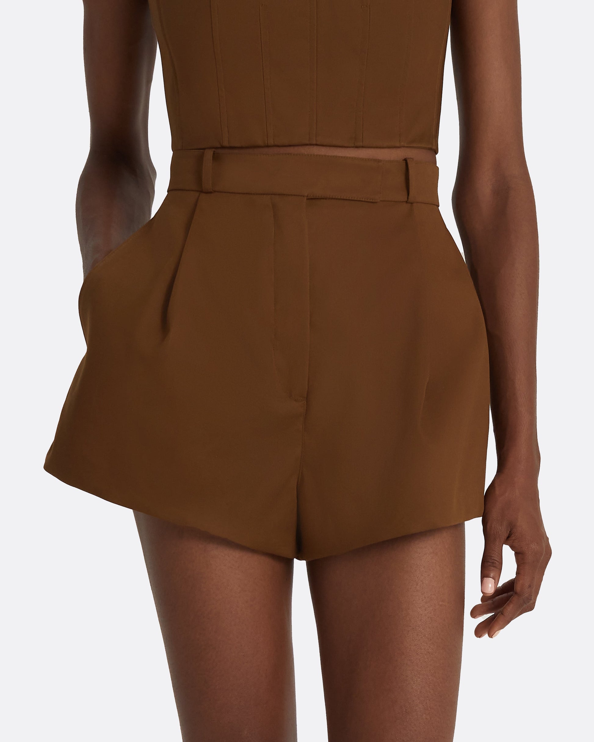 Paper bag style short with tailored waistband in deep brown Trenching.
