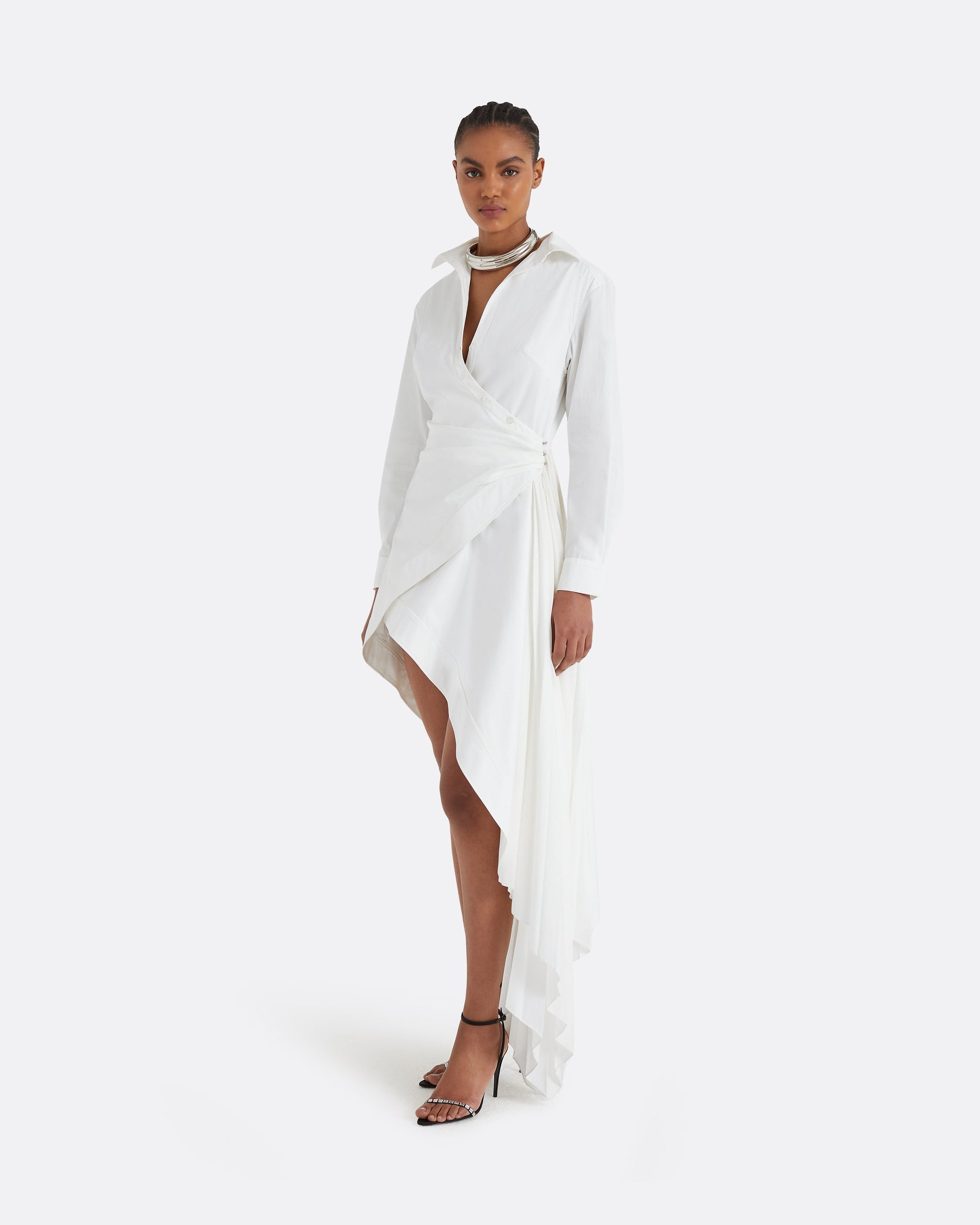 Statement cotton shirting with knot drape and classic shirt detailing in ivory Cotton Poplin and Cotton Voile.