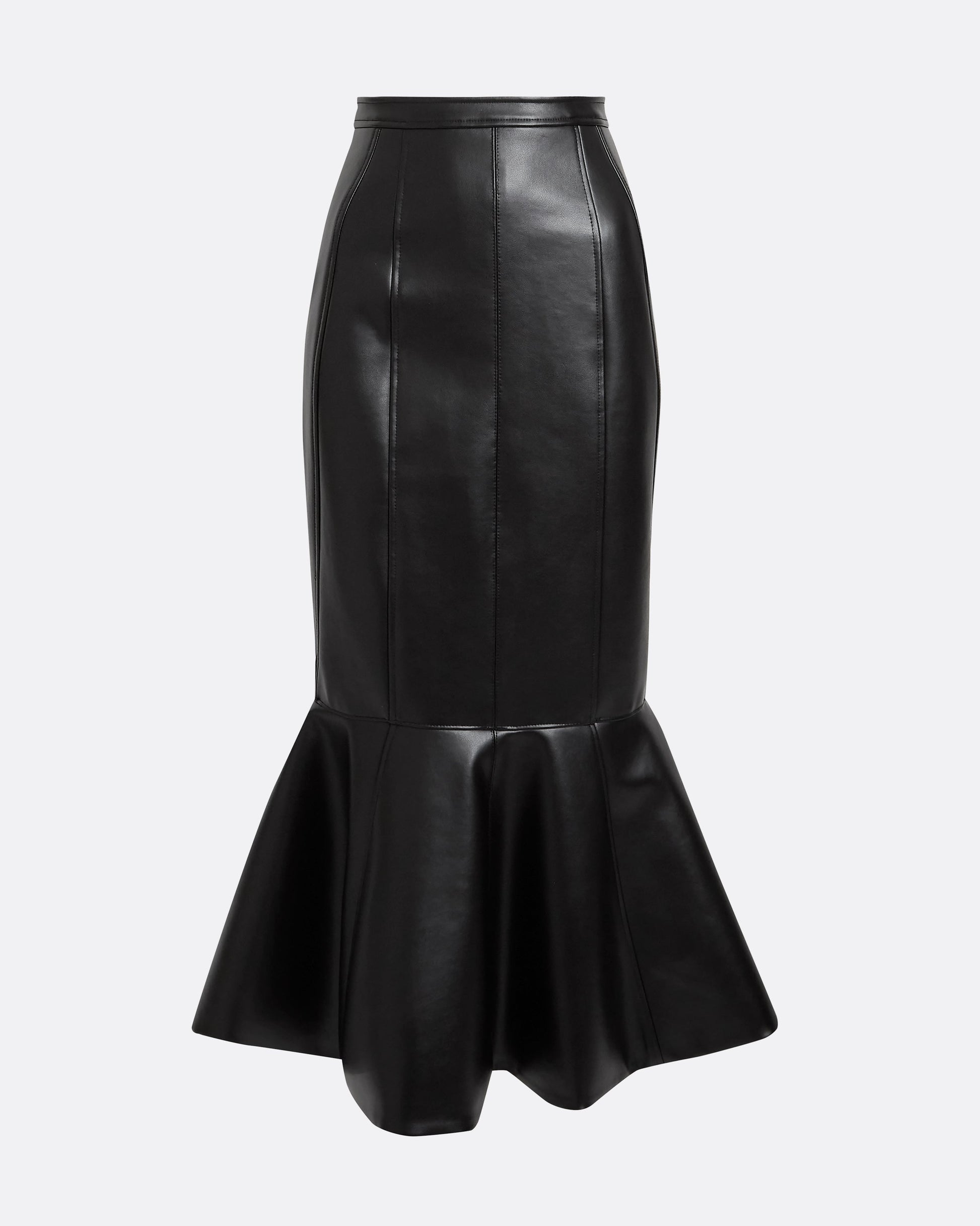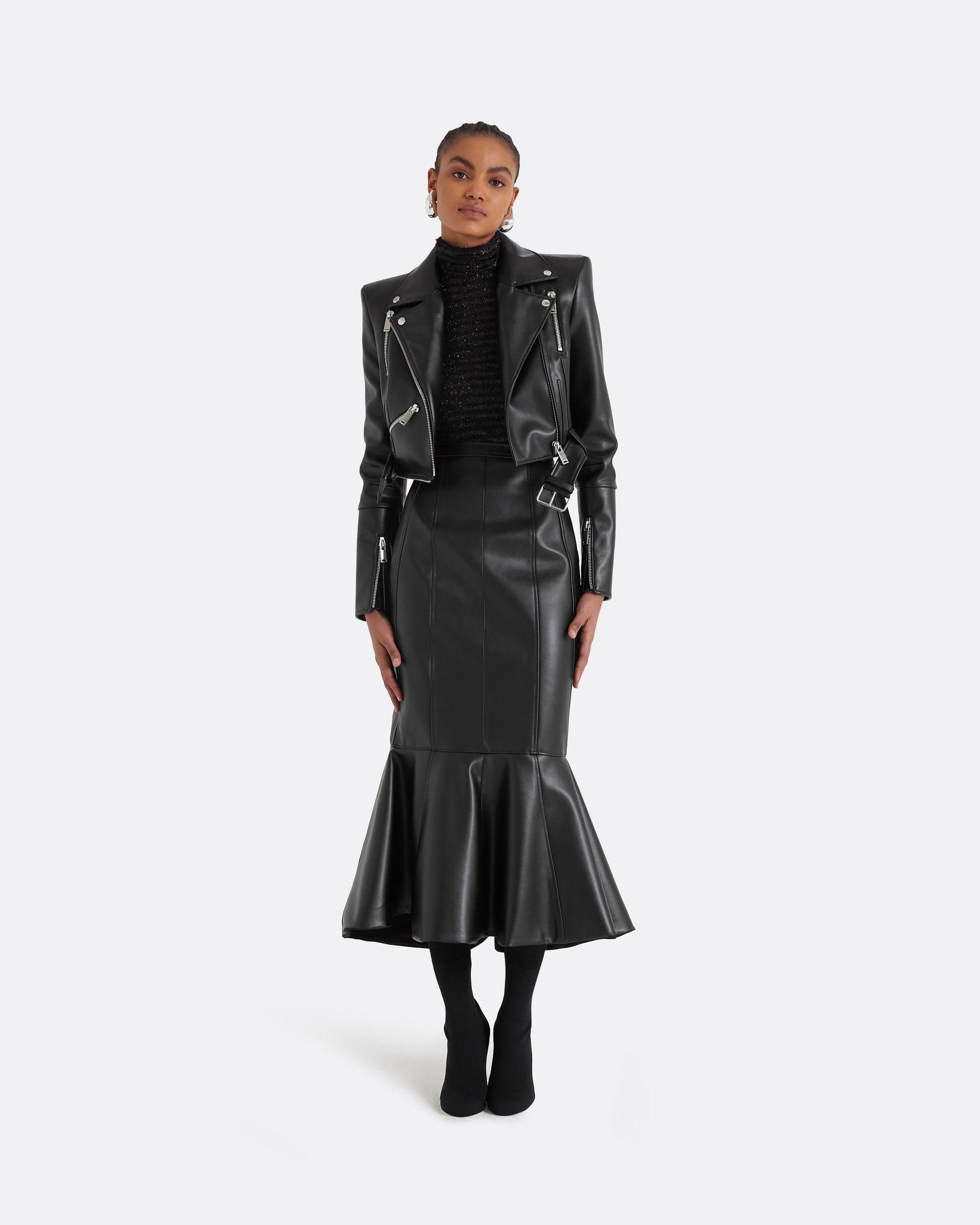 Cocktail length skirt with considered seam detailing, top stitching and flared peplum in black Cactus Vegan Leather.