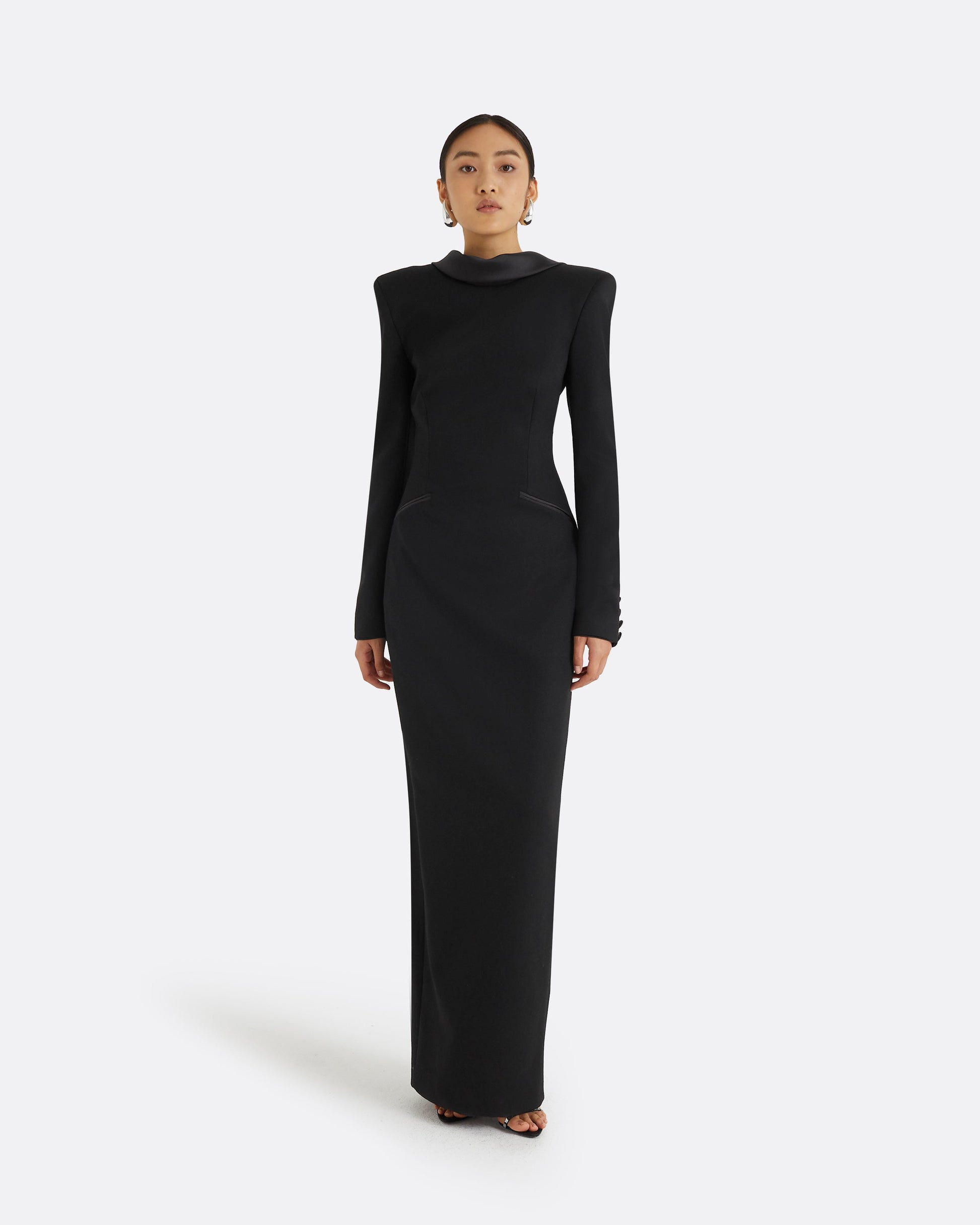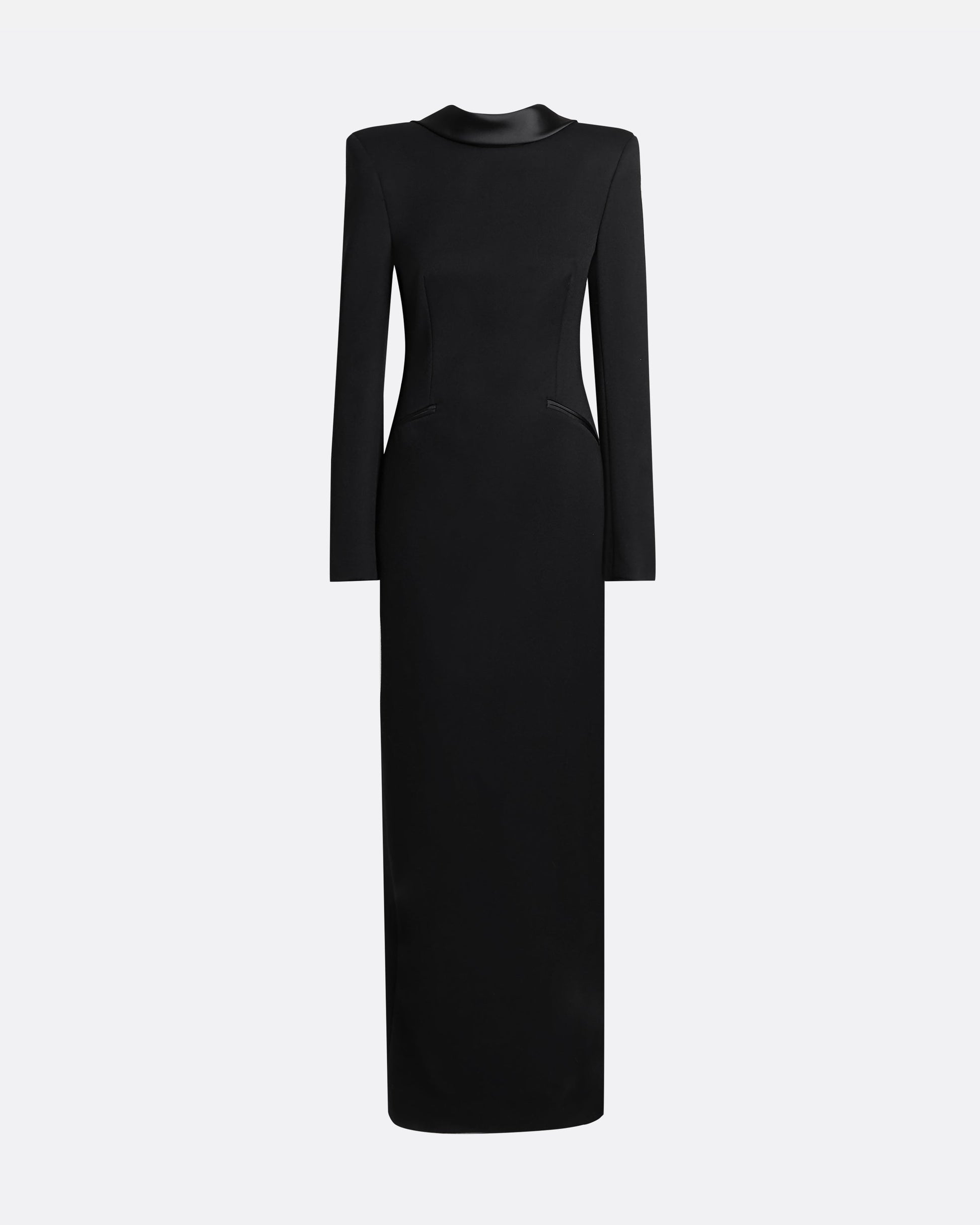 Tailored, floor length gown in tuxedo style and lapel detailing, low back in black on black Damon Wool and Shine Satin Stretch.