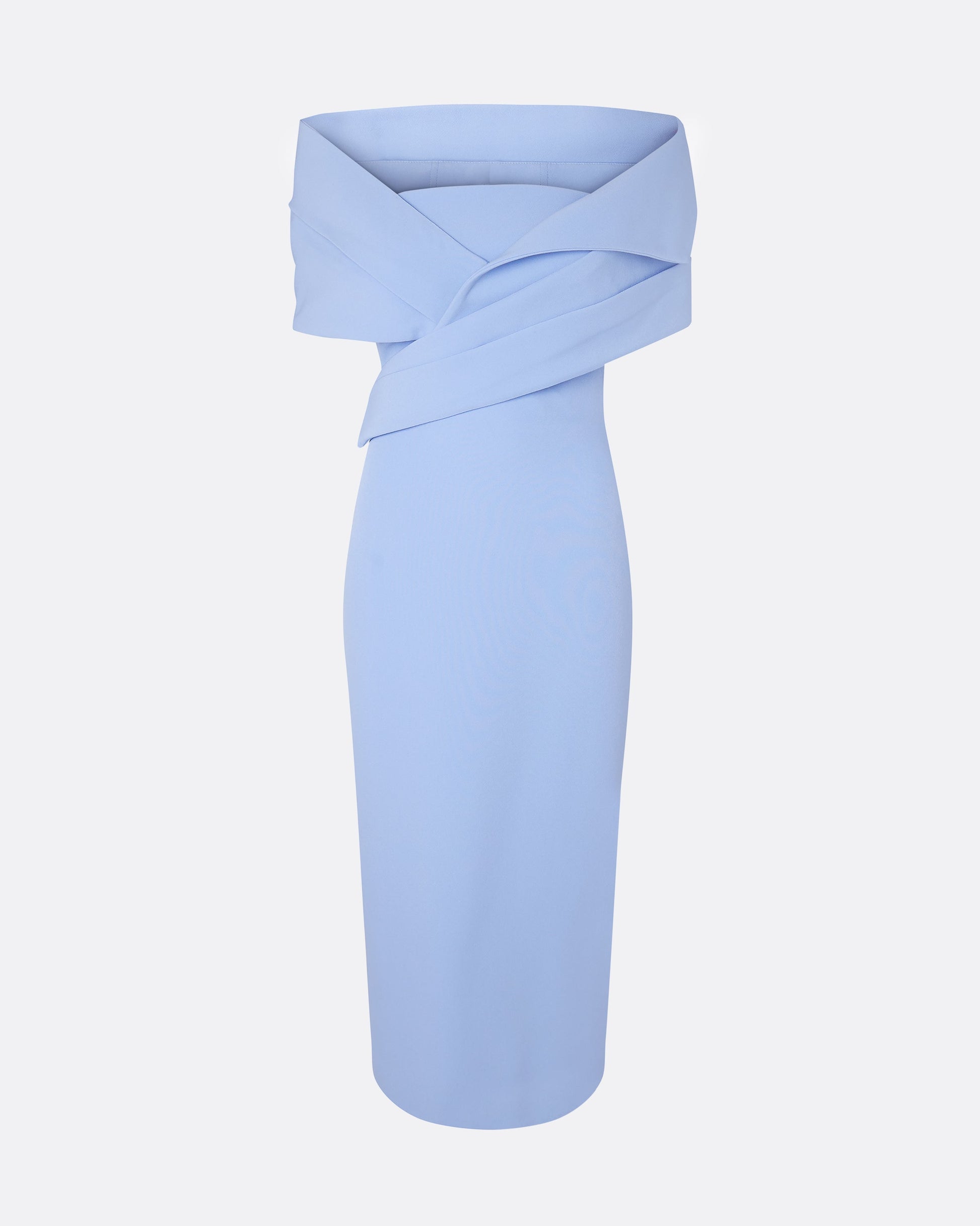 Mid-calf cocktail dress with draped shoulder in carolina blue Heavy Crepe.
