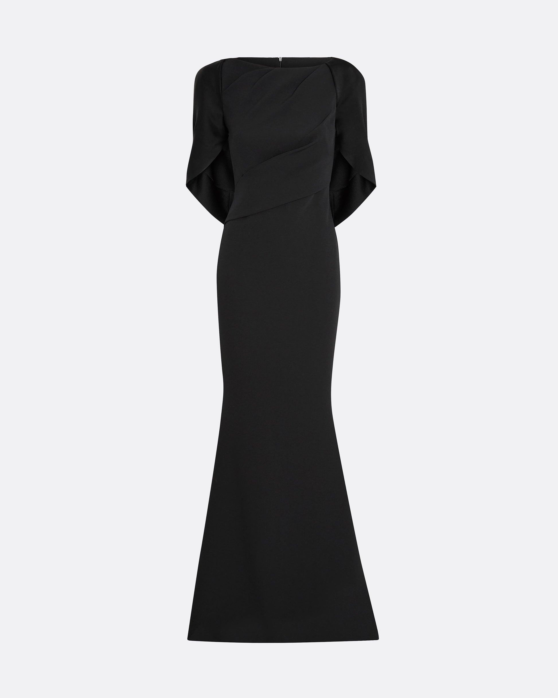 Soft fishtail gown with flattering bodice detail and elegant shoulder drape in black Heavy Crepe and Satin Back Crepe.