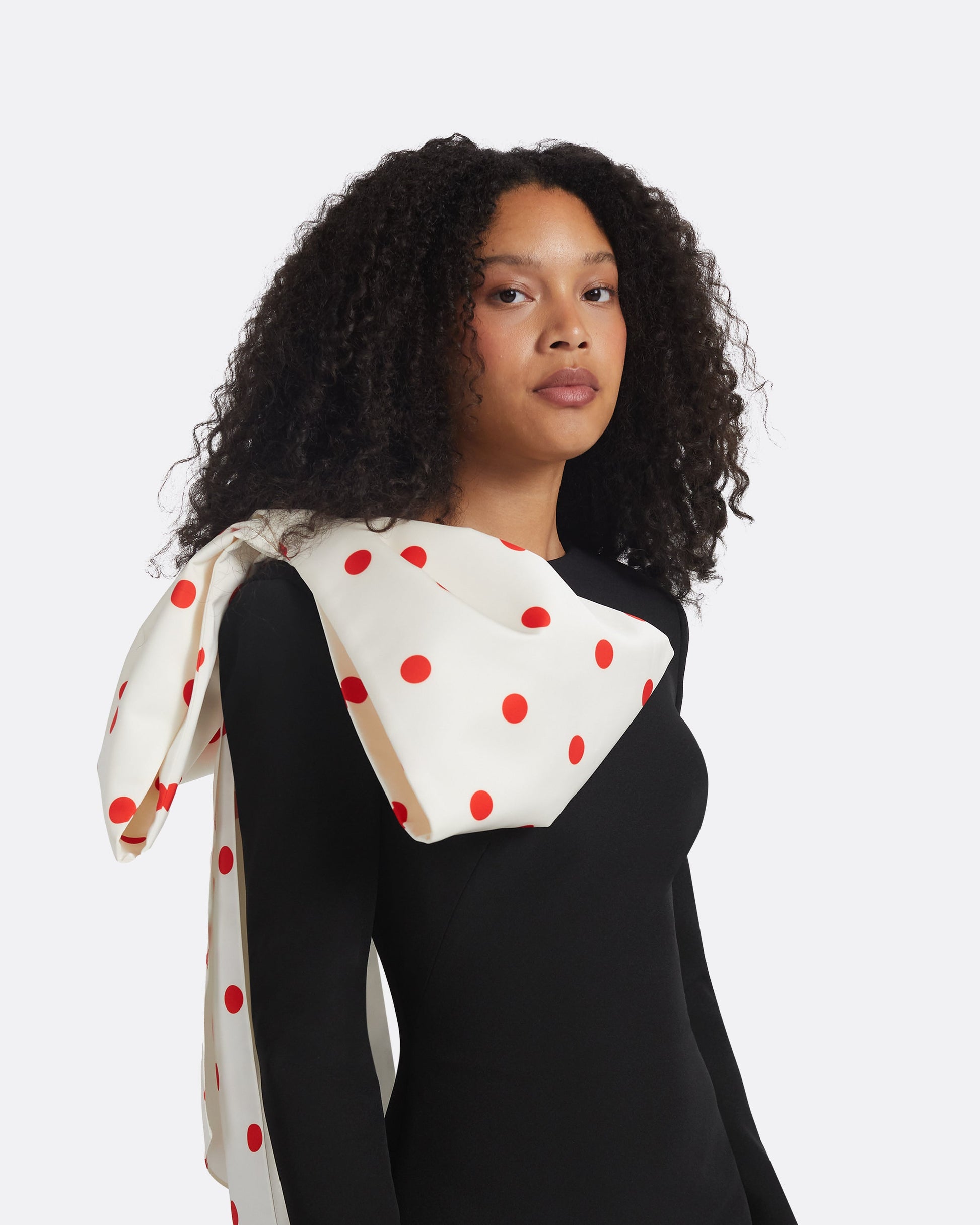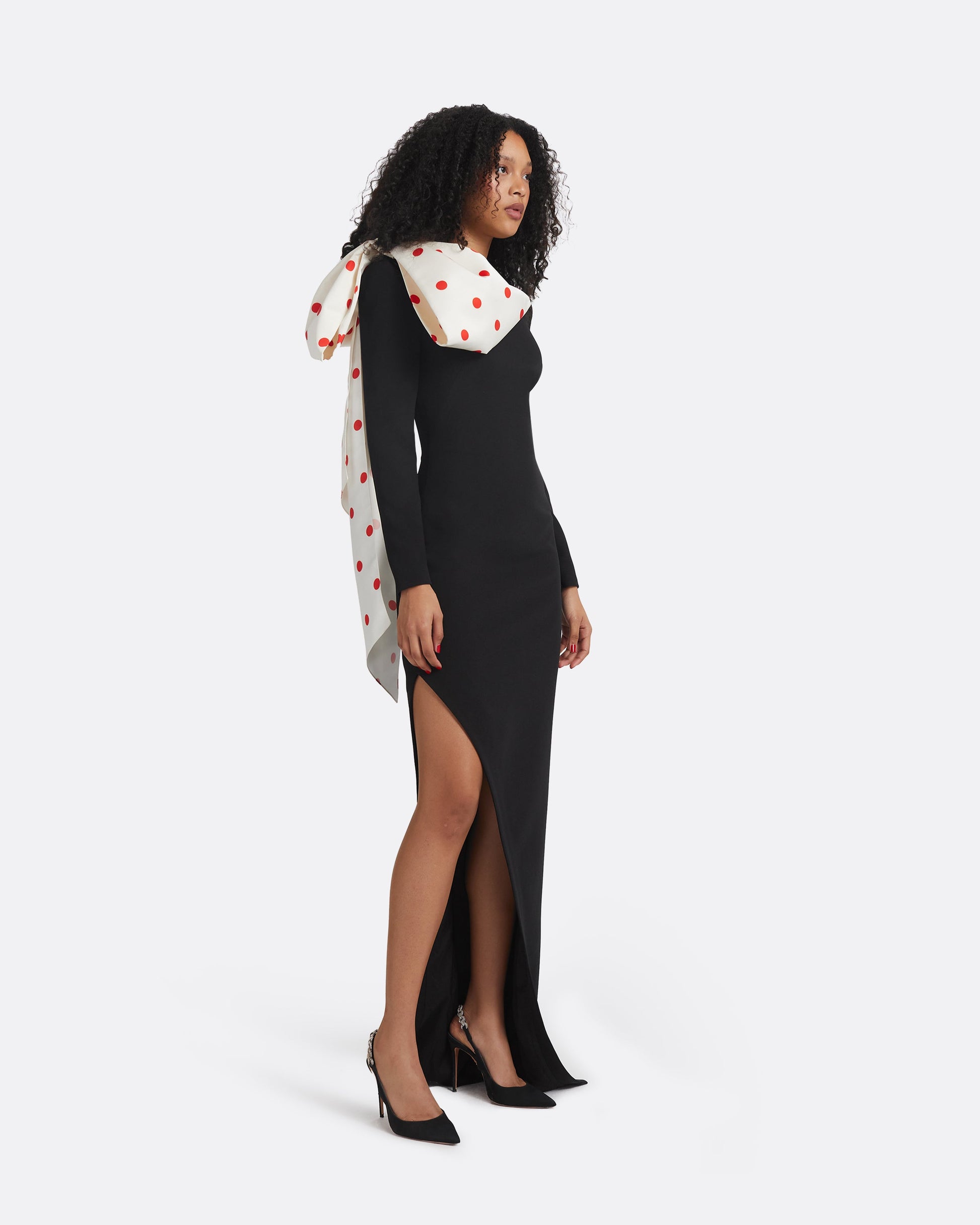 Gown with strong shoulder, slit and bow drape in egret/ lacquer red Polka Barcelona on black Heavy Crepe.