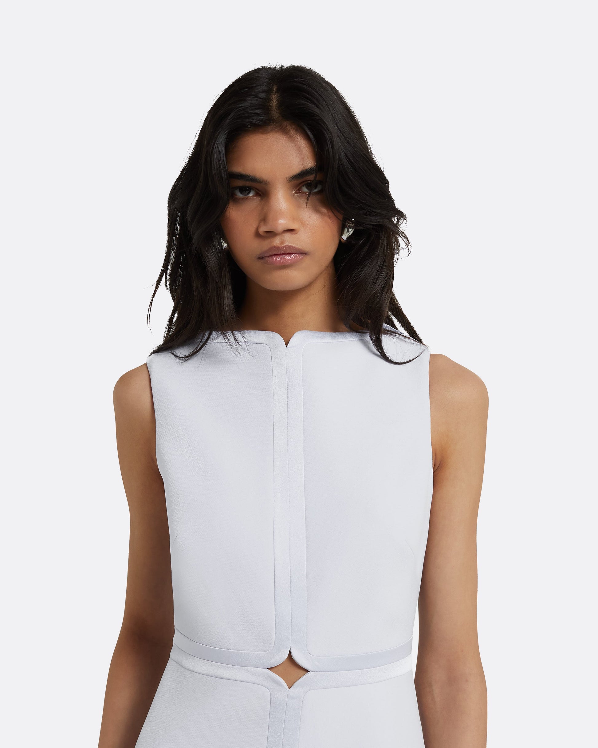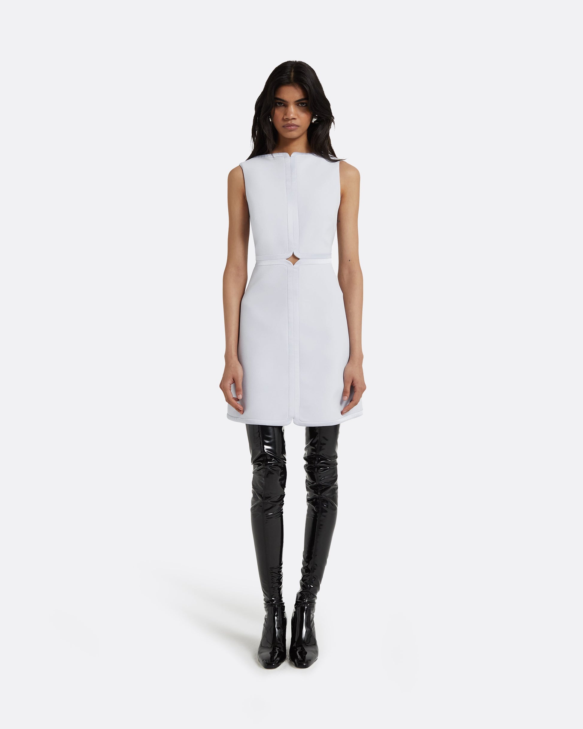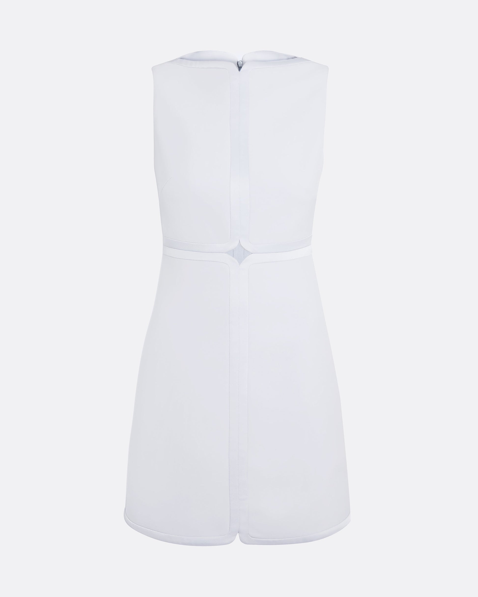 Mini dress with high boat neck and seam detailing in silk blue Heavy Crepe and Light Satin Back Crepe.