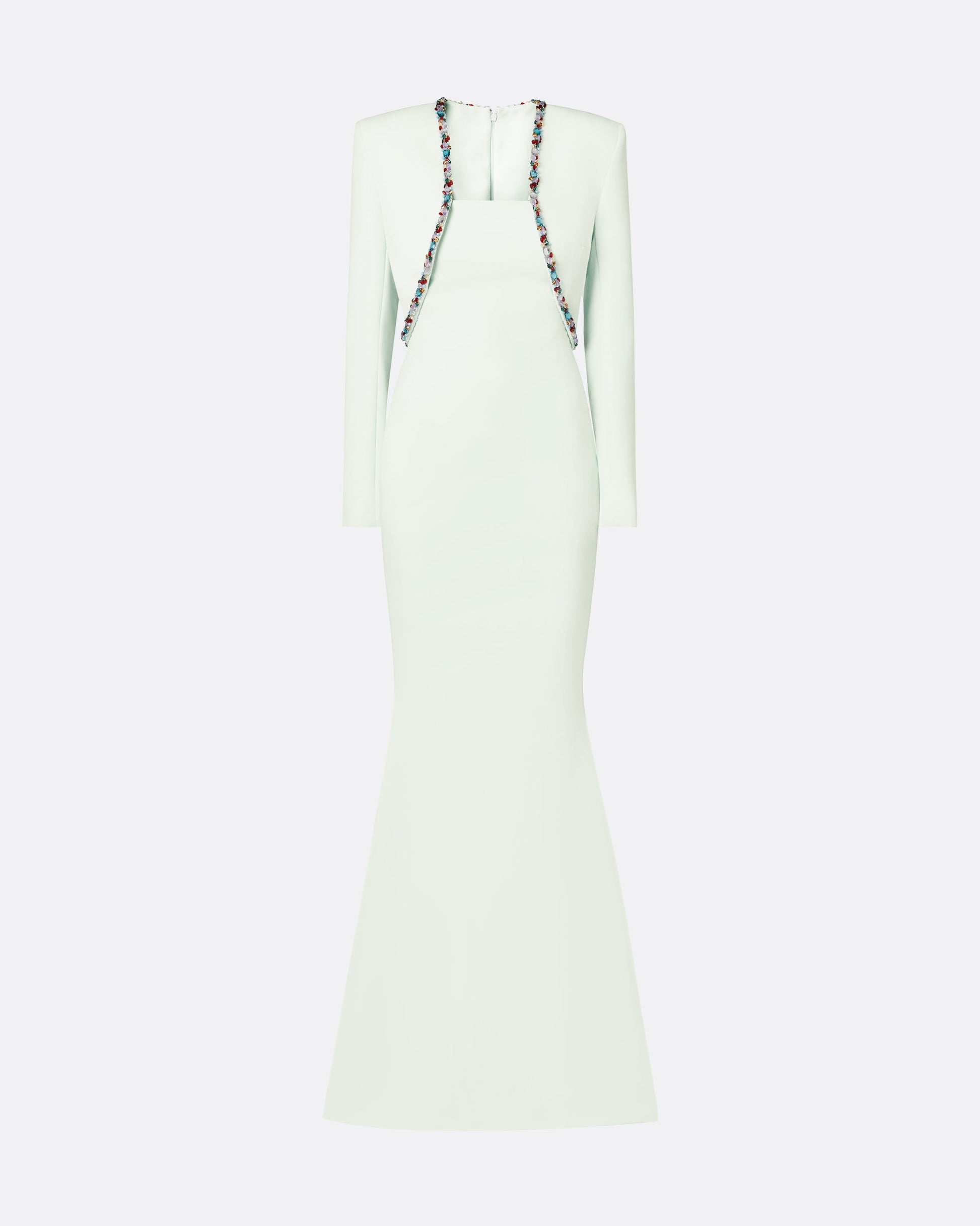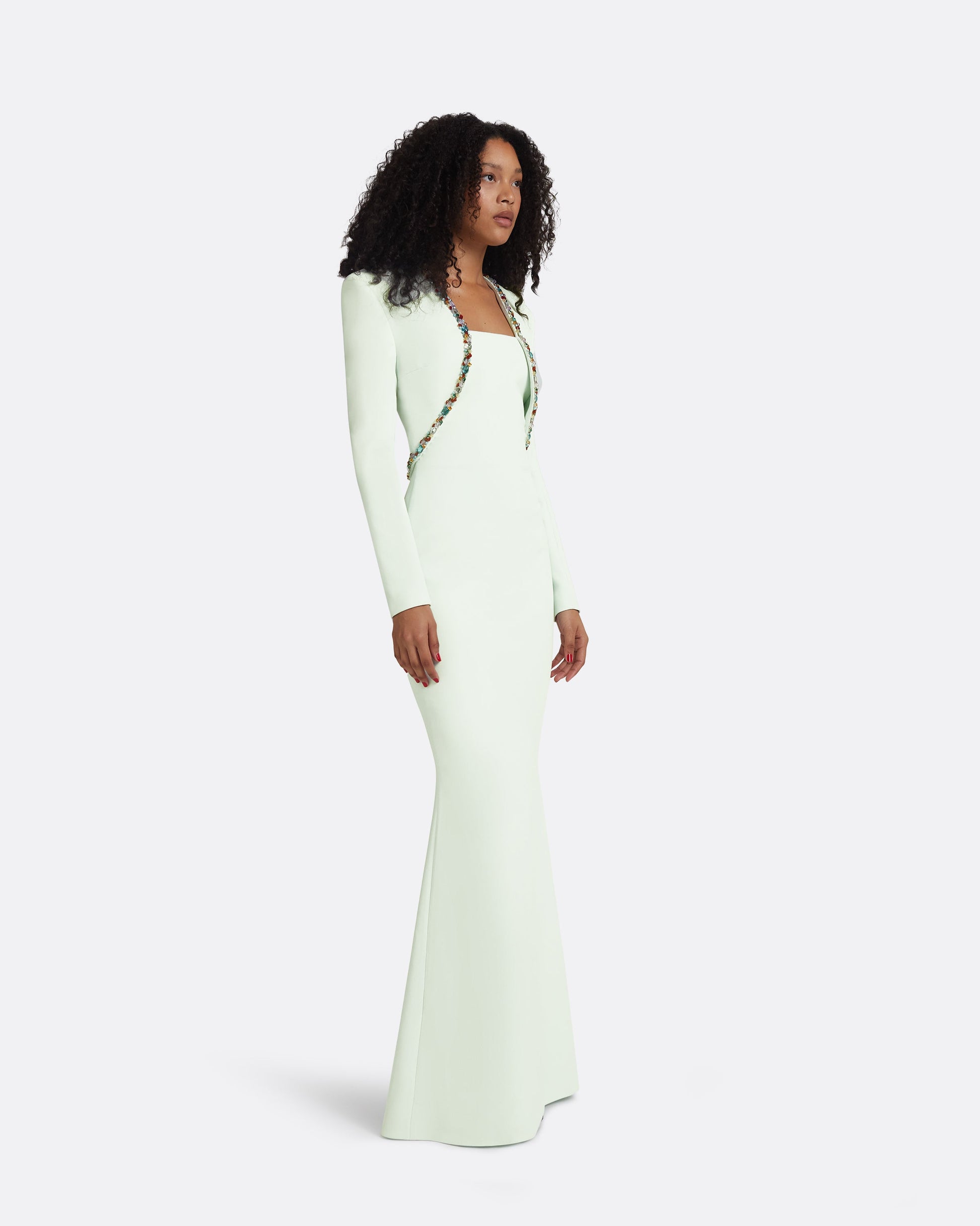 Soft, fishtail gown with curved seam detail in spearmint Heavy Crepe with multi-brights Picasso Trim embroidery.