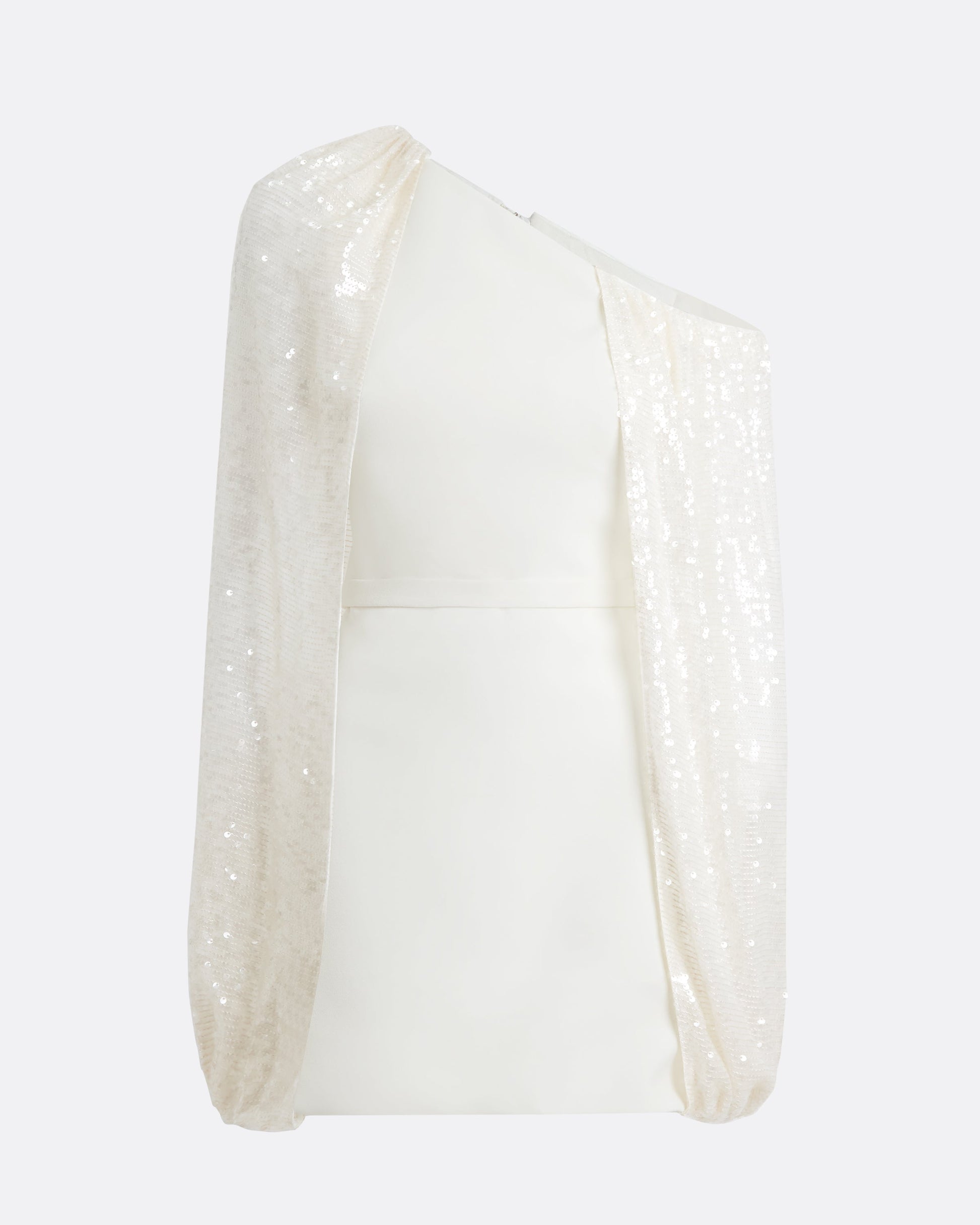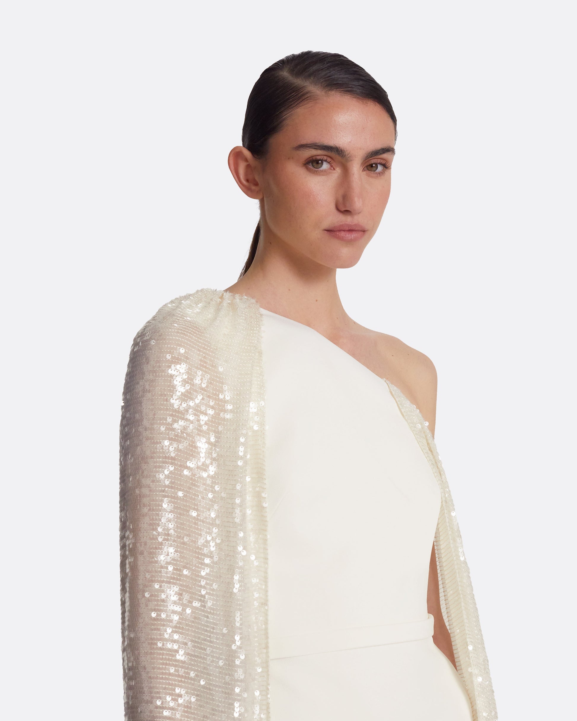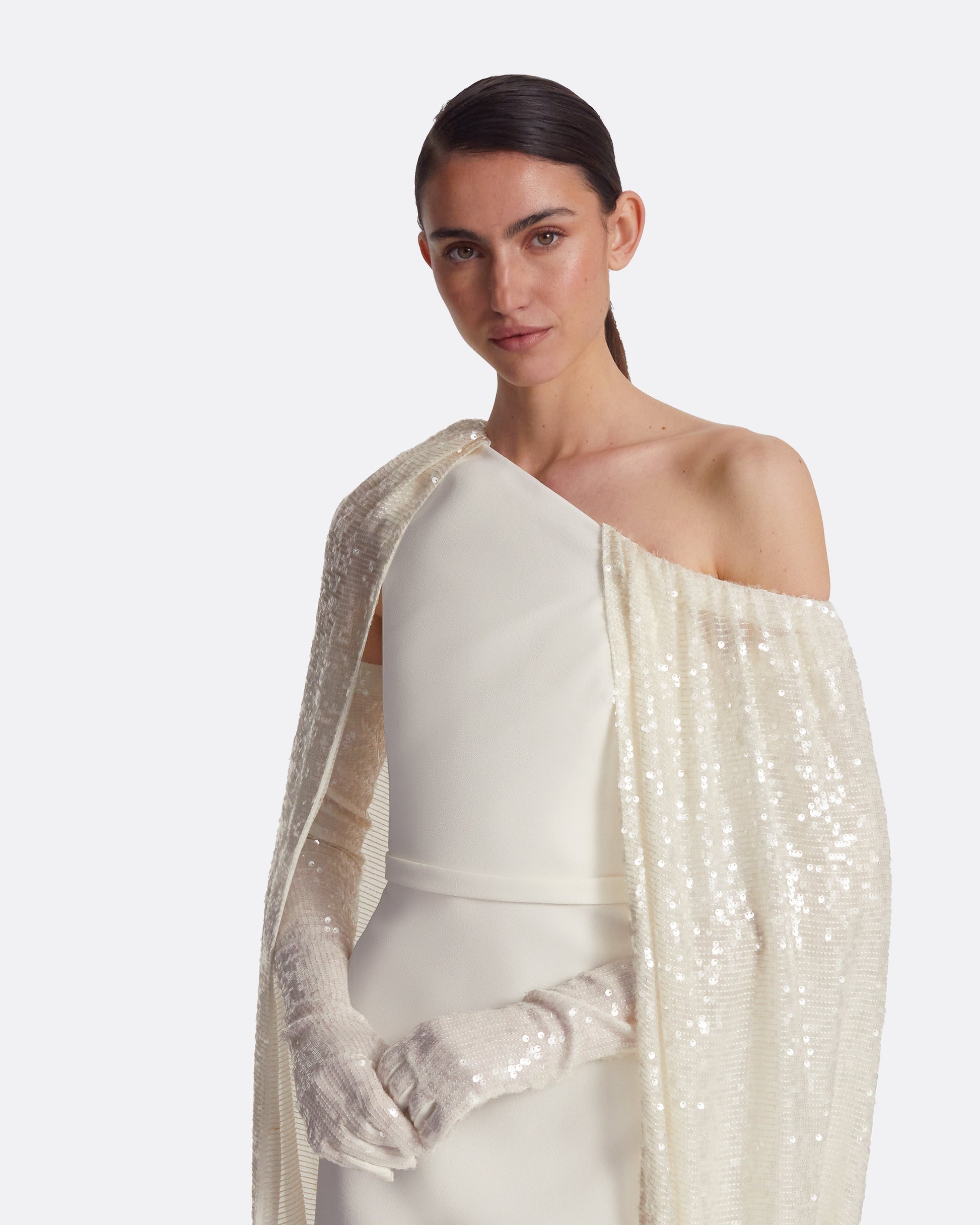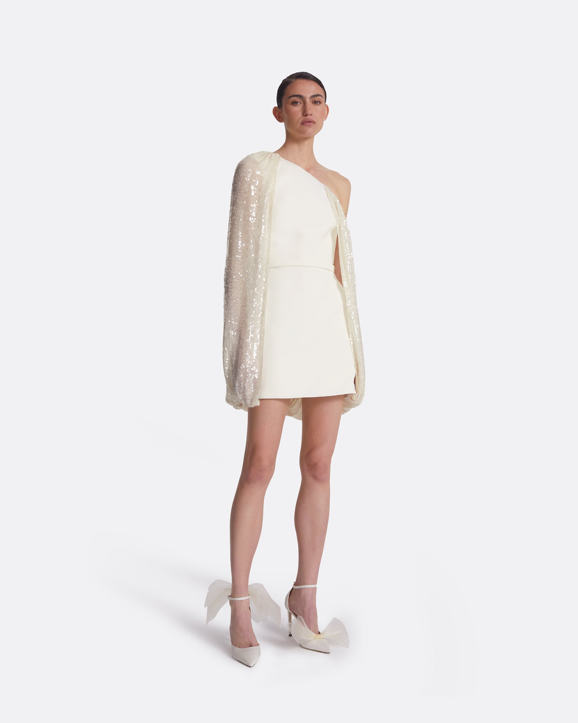 Mini dress with cocoon cape detail in ivory Heavy Crepe and Fluid Sequins.
