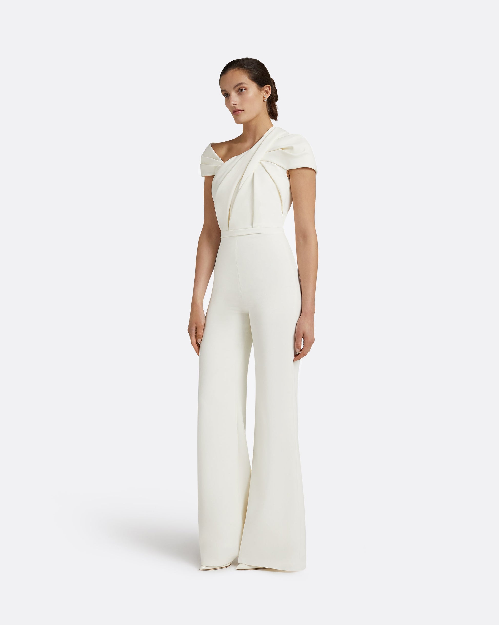 Jumpsuit with interlocking twist drape top and flared leg in ivory.