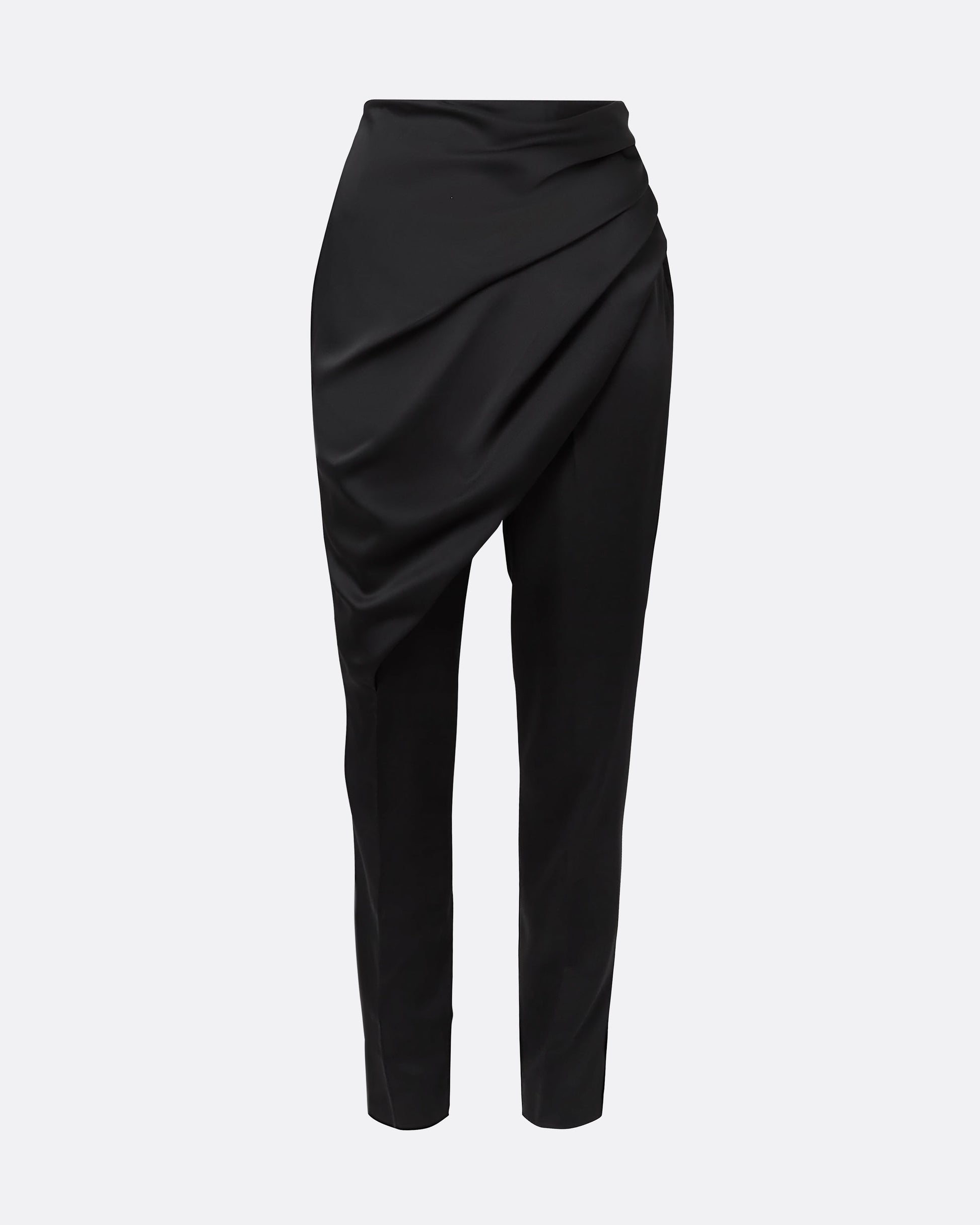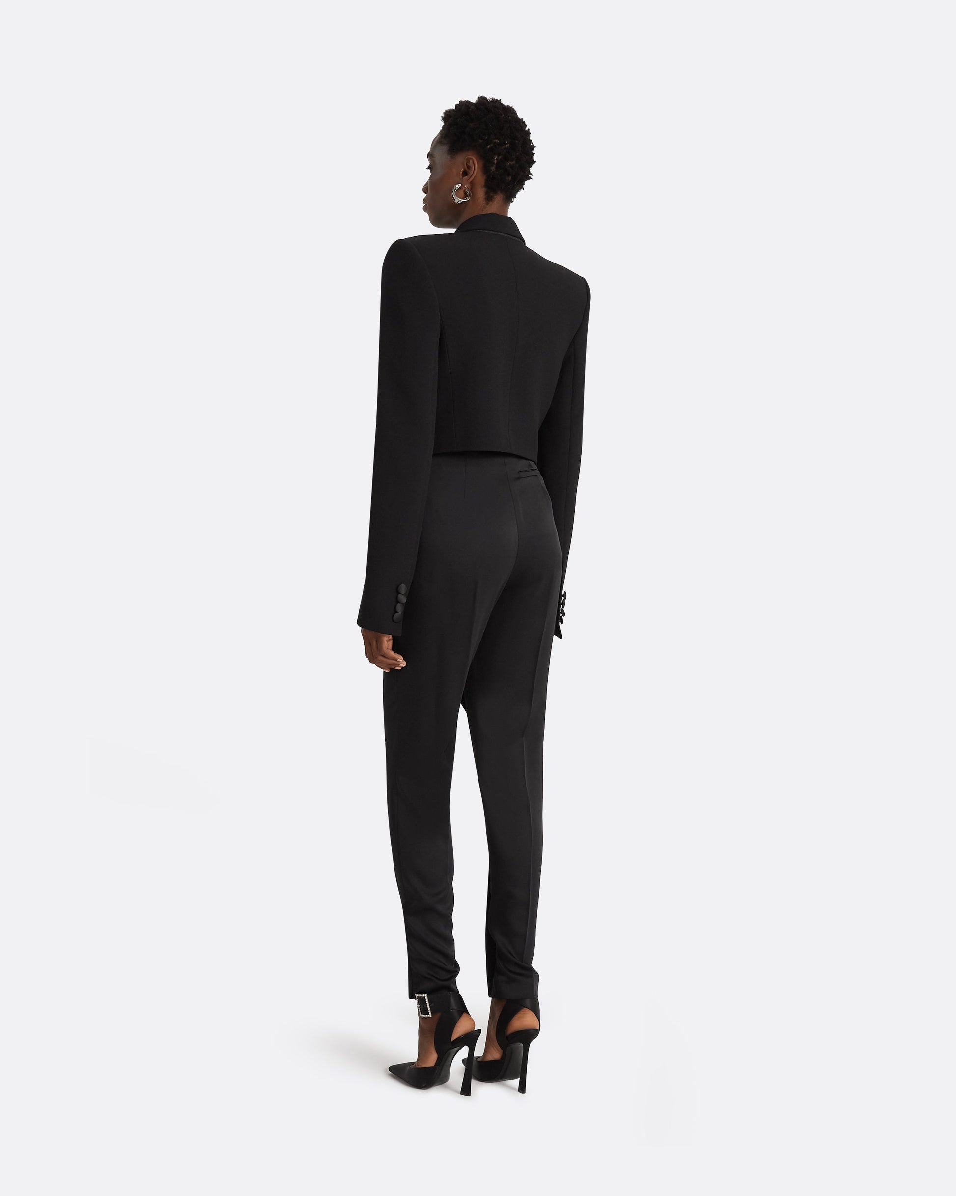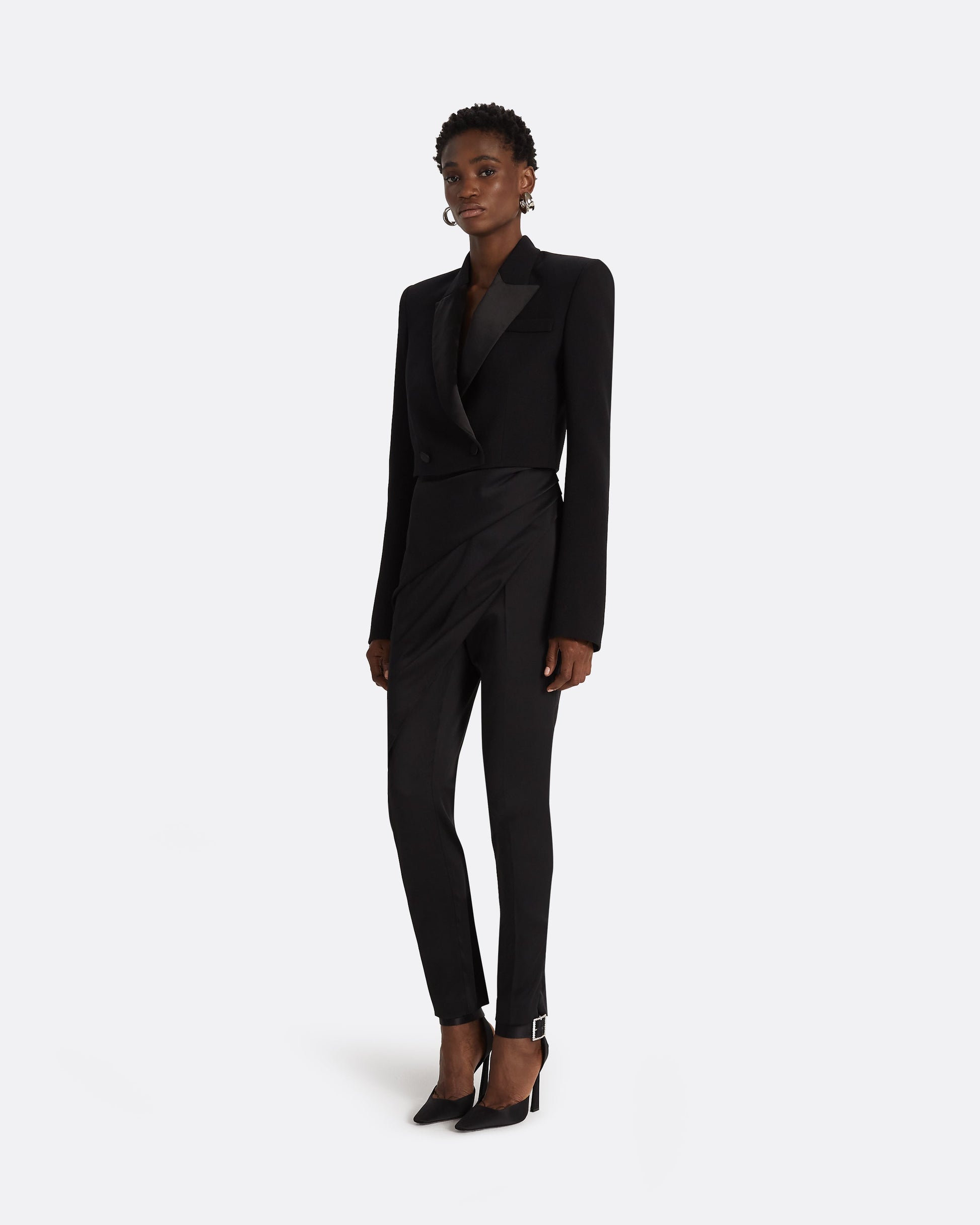 Slim tuxedo leg with front drape in black Light Satin Back Crepe.