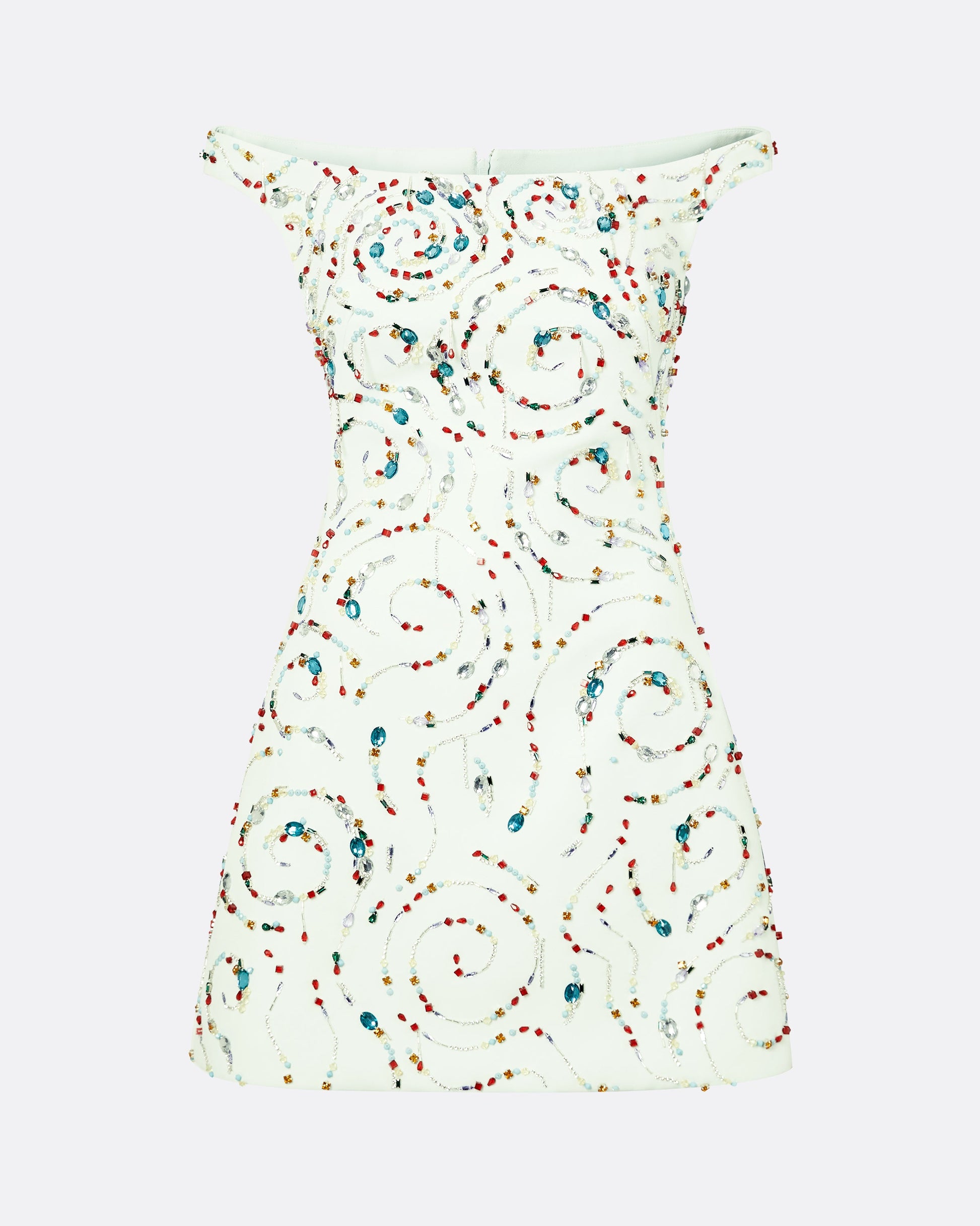 Off the shoulder, A-line mini dress in multi-brights Picasso Swirl embroidery on spearmint Heavy Crepe.