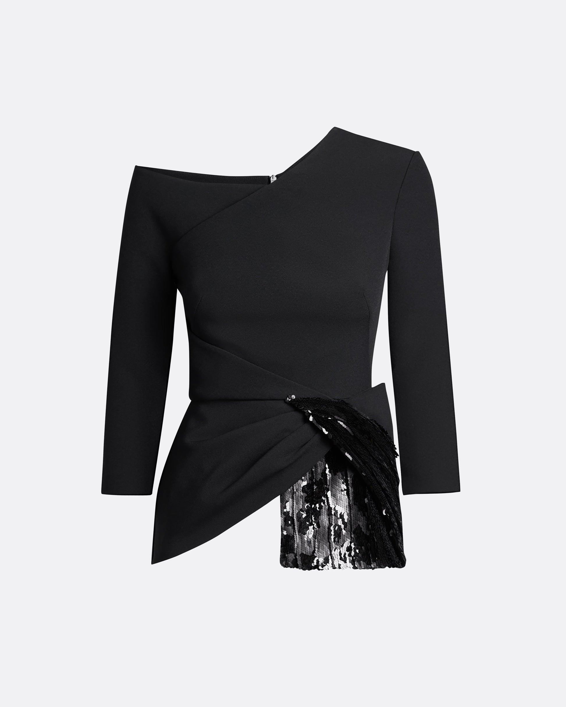 Long sleeved top with asymmetric shoulder and contrast draped peplum in black Heavy Crepe and Serpentine Sequins.