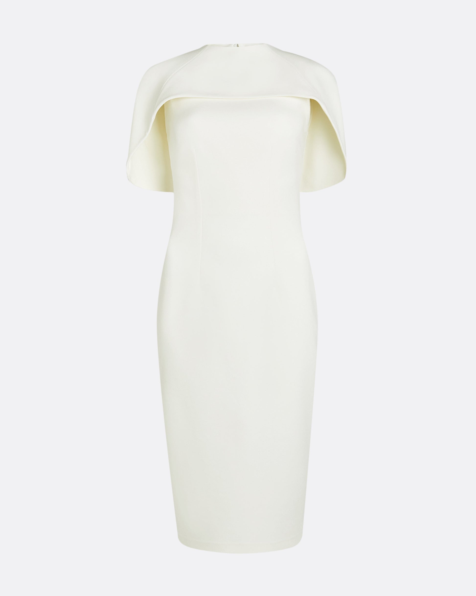 Raised collar midi dress shoulder cape and back drape detail in ivory. Item fully lined.