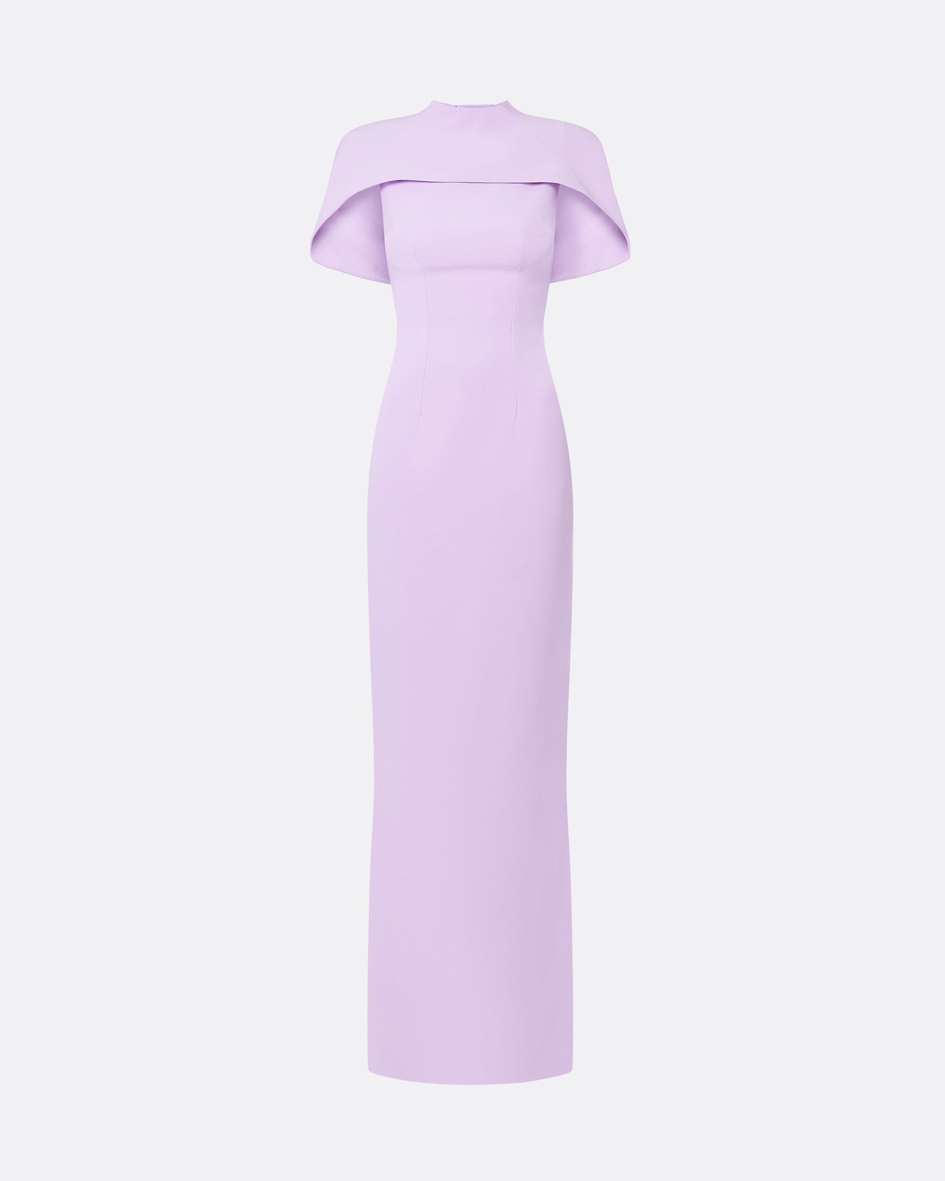 Raised collar long dress with shoulder cape and back drape detail in lavender heavy crepe.