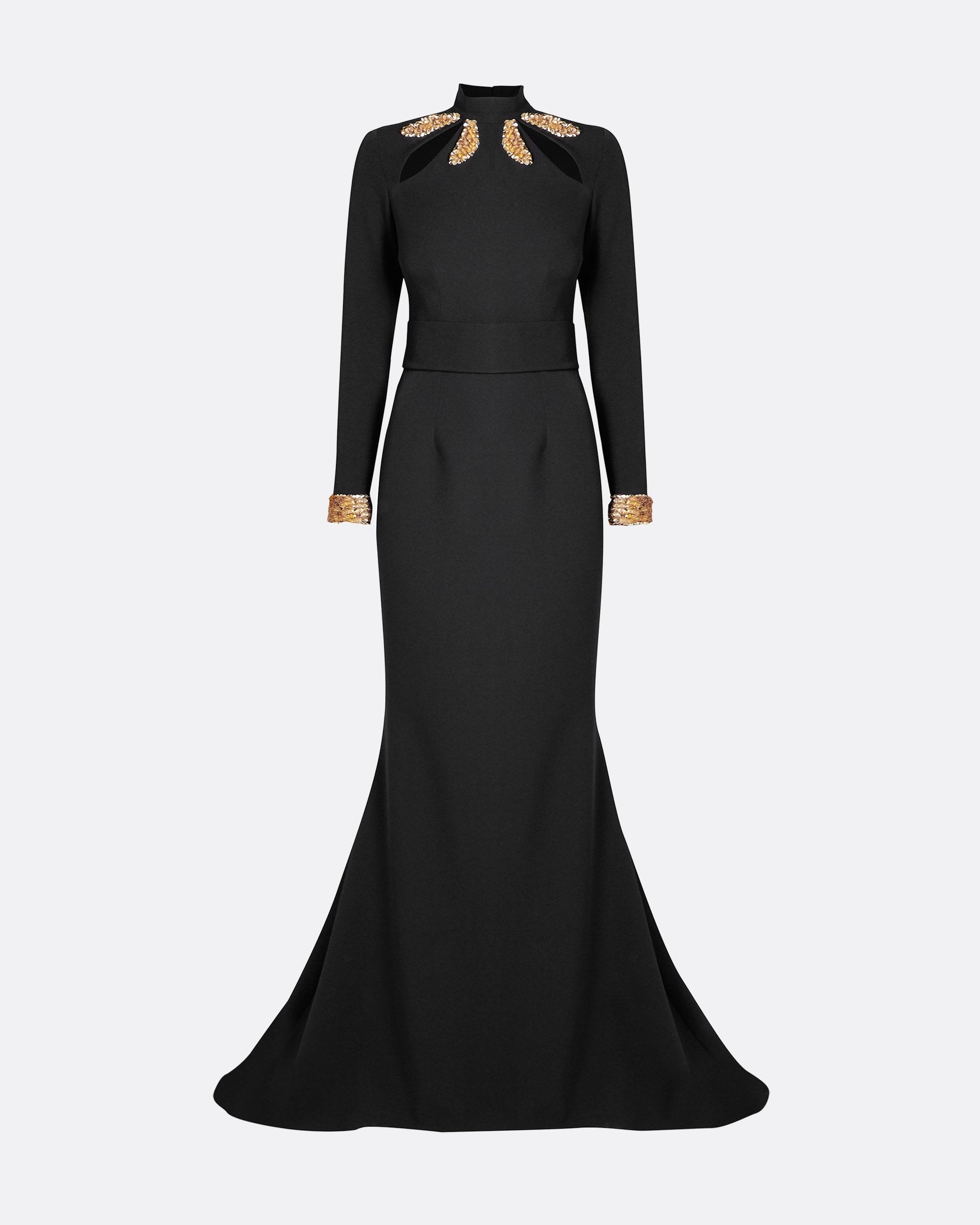 Black long sleeve long dress with mandarin collar and neck cutout, with gold Curled Leaf embroidery detail.