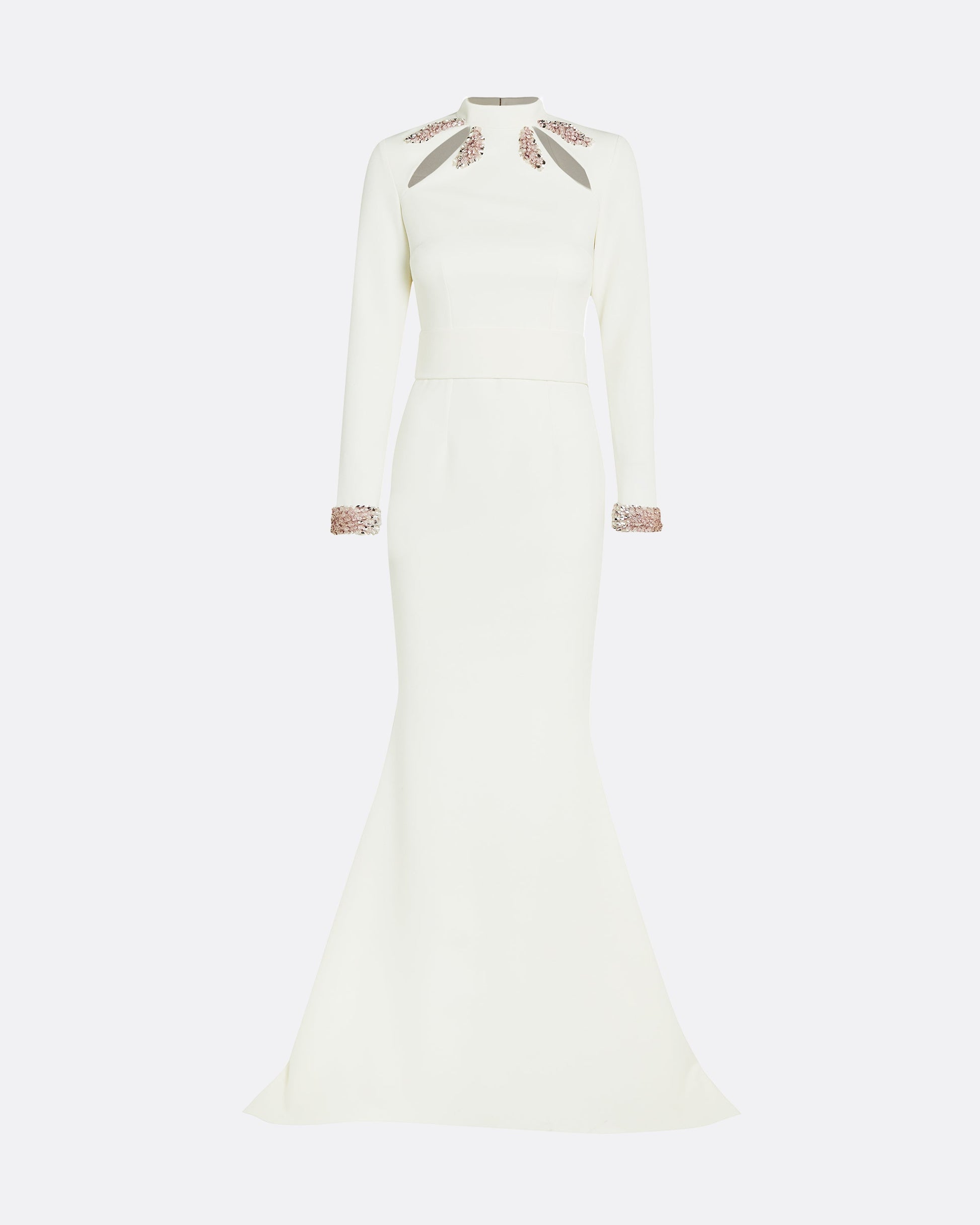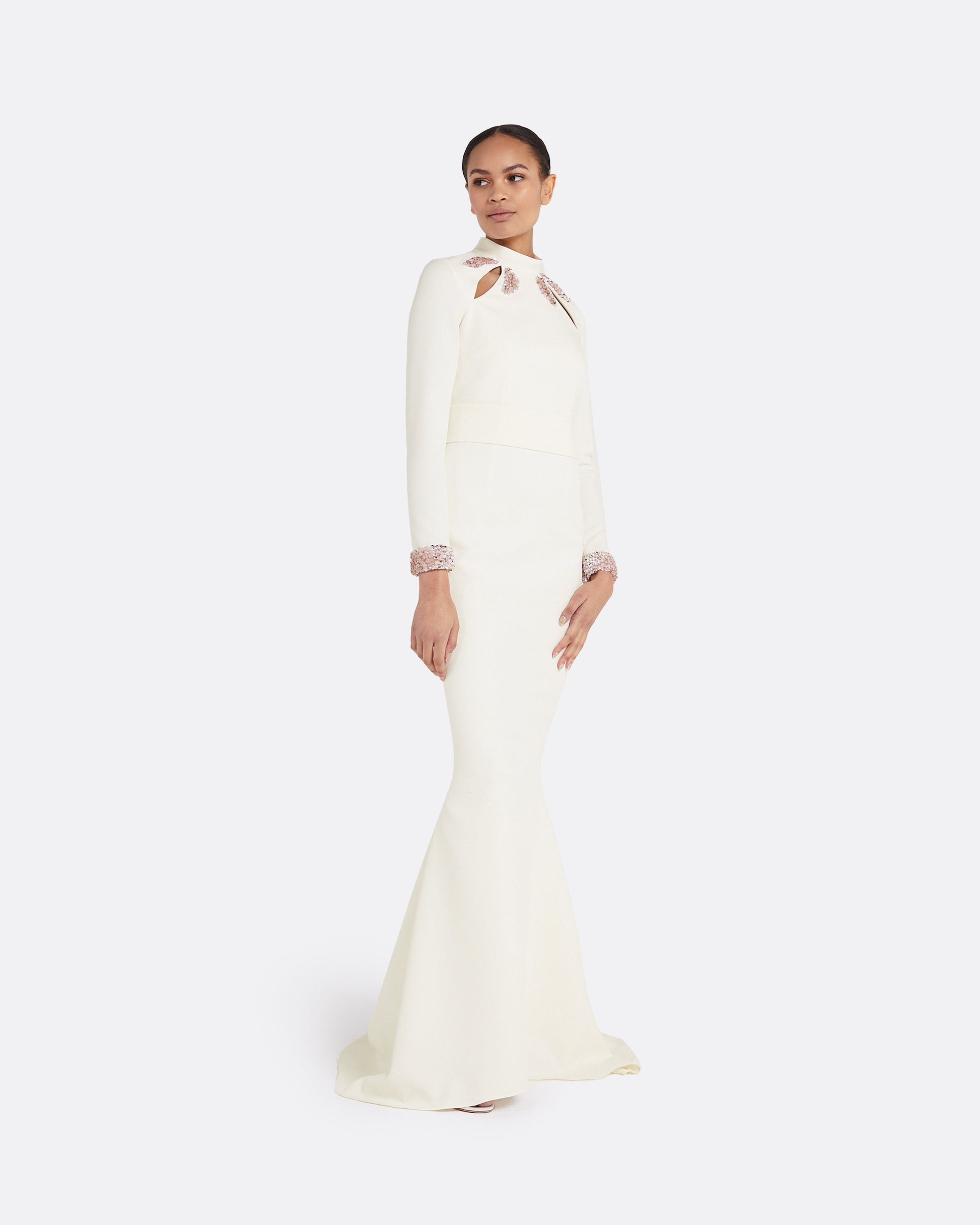 Ivory long sleeve long dress with mandarin collar and neck cutout, with powder Curled Leaf embroidery detail.