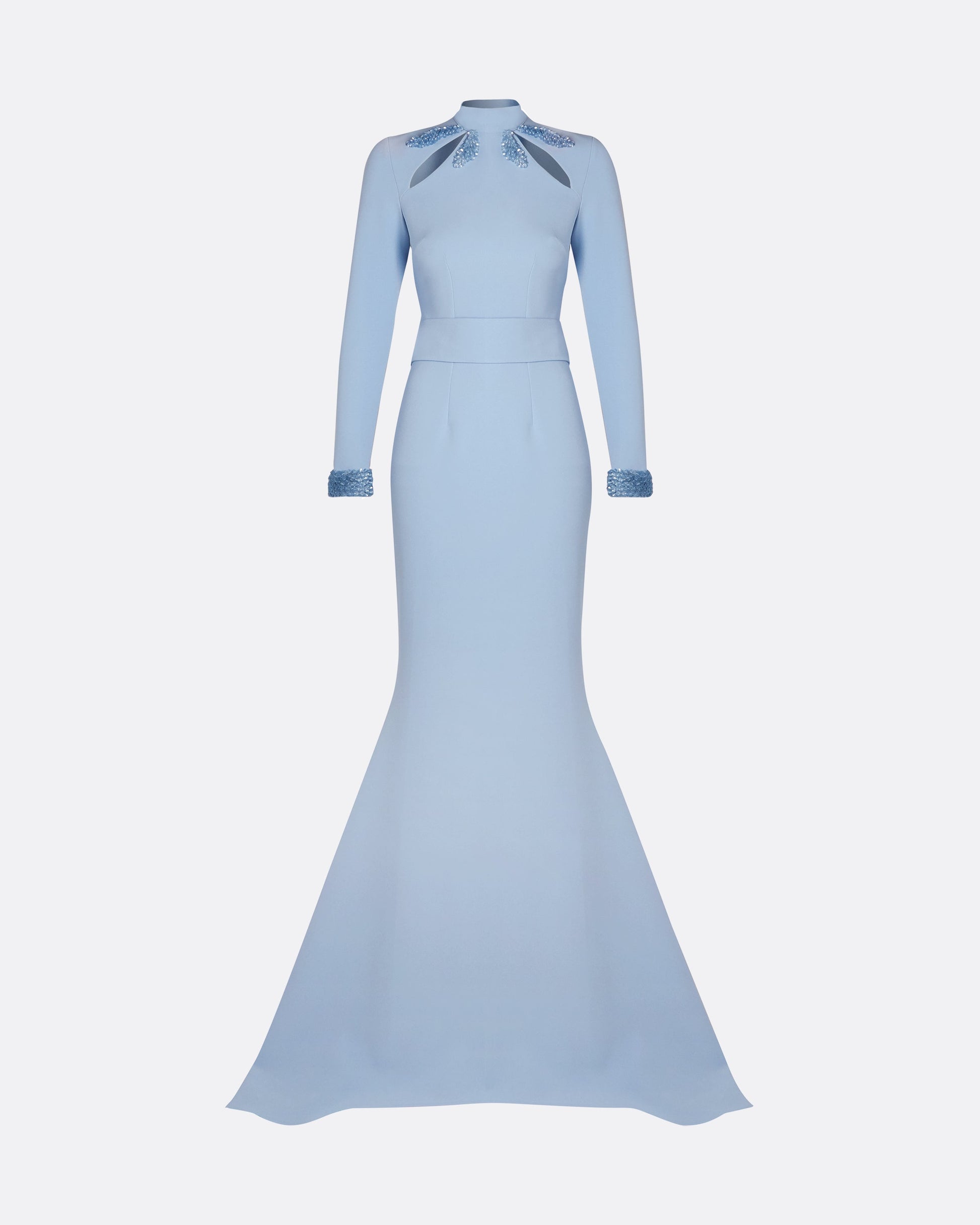 Soft sky long sleeve long dress with mandarin collar and neck cutout, with soft sky Curled Leaf embroidery detail.