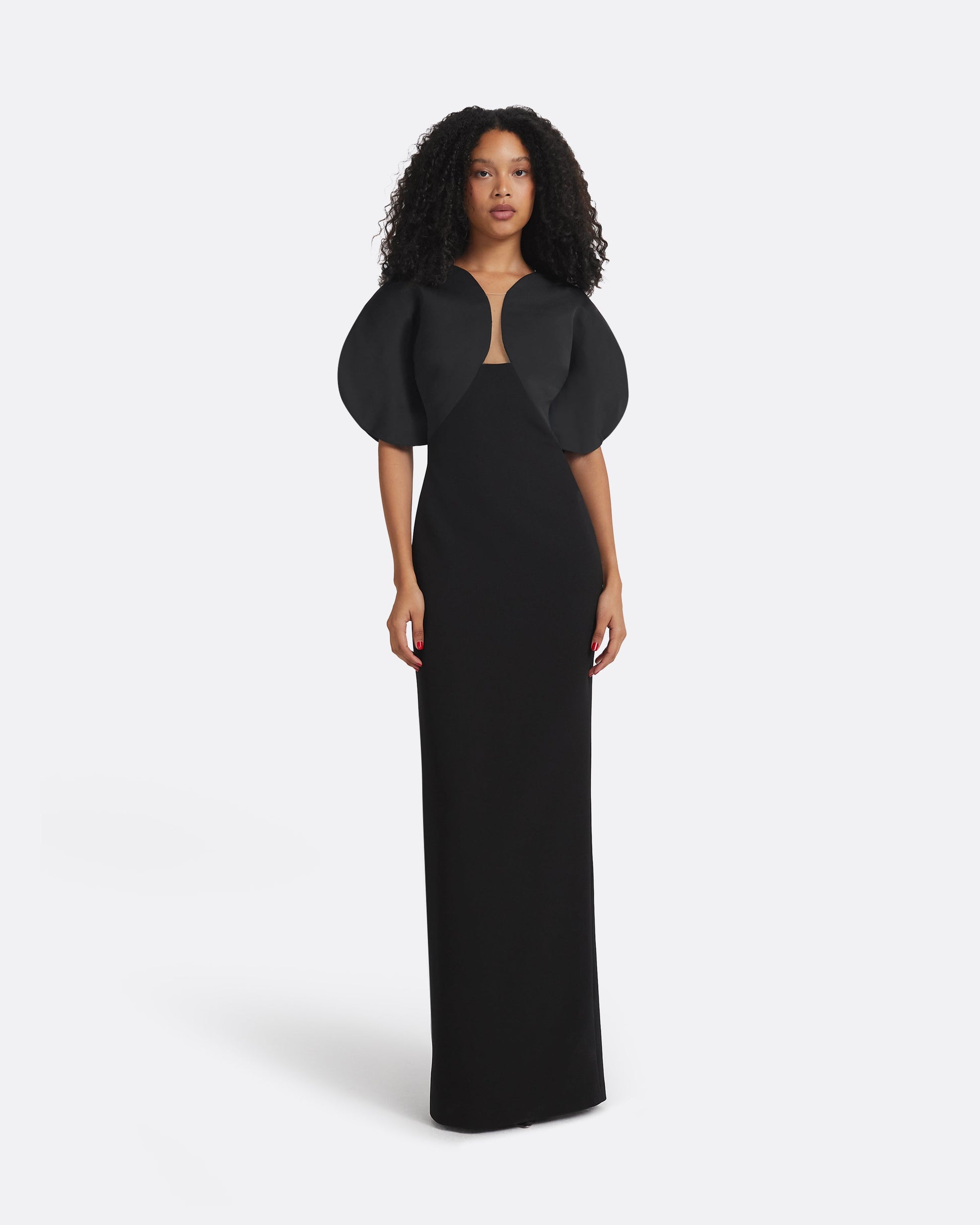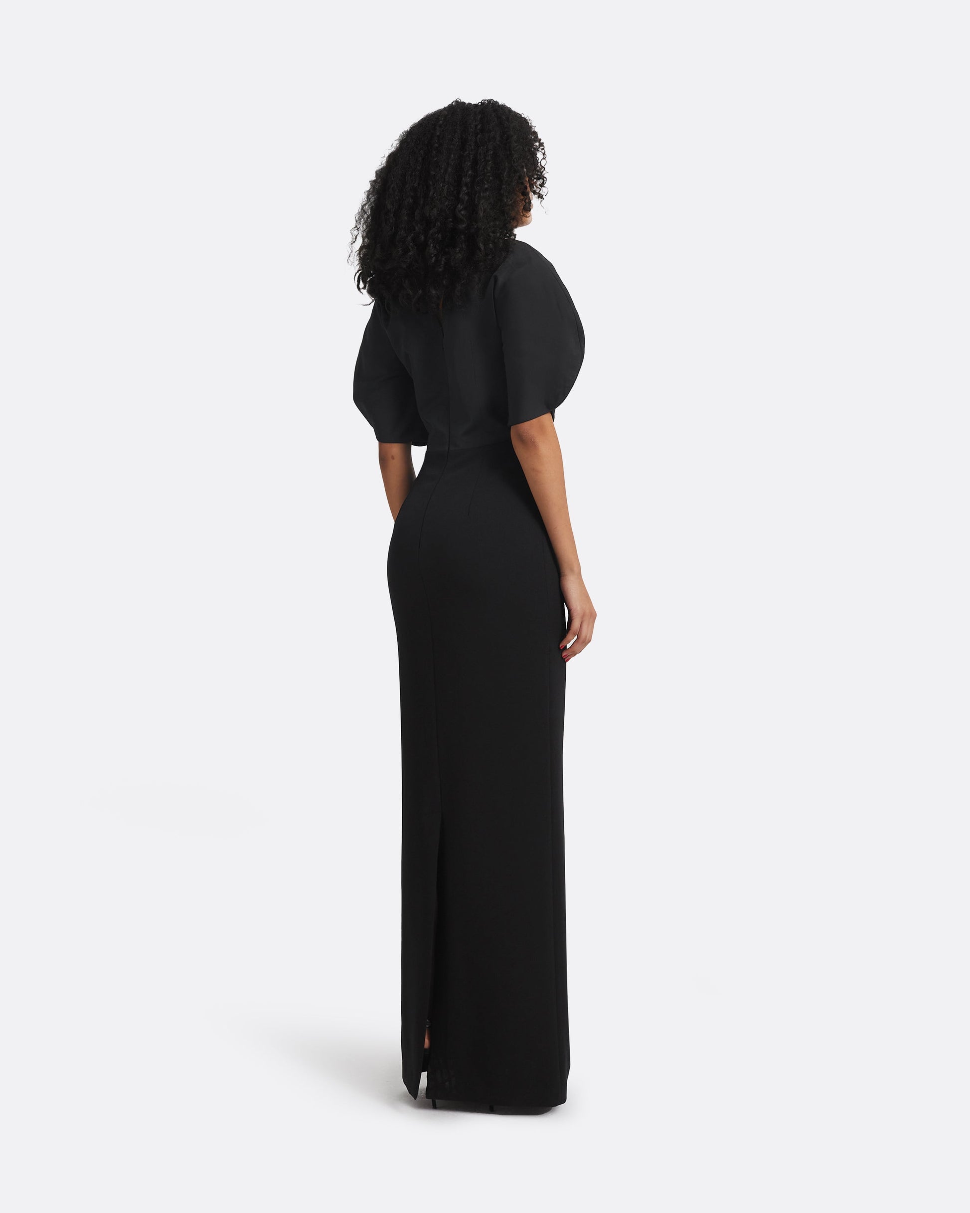 Column gown with seam detail and cocoon sleeve in black Heavy Crepe and Faille.