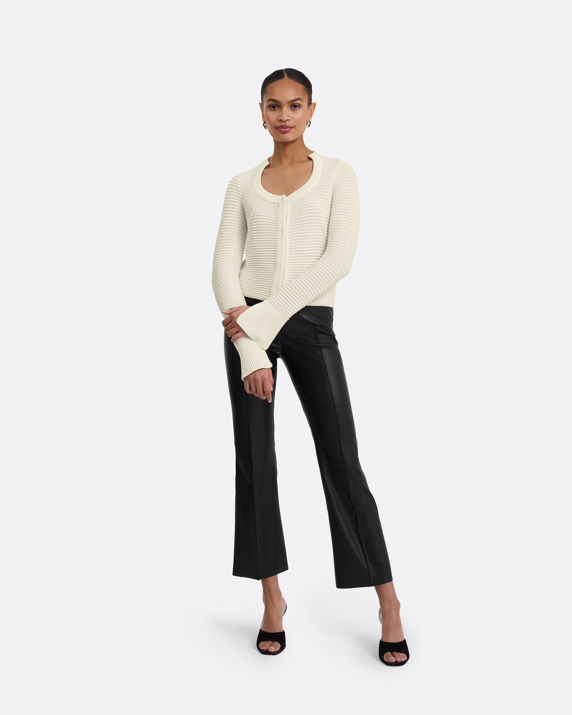 Styled with Mari trousers in black Vegan Leather, and Kelly skirt in ivory.