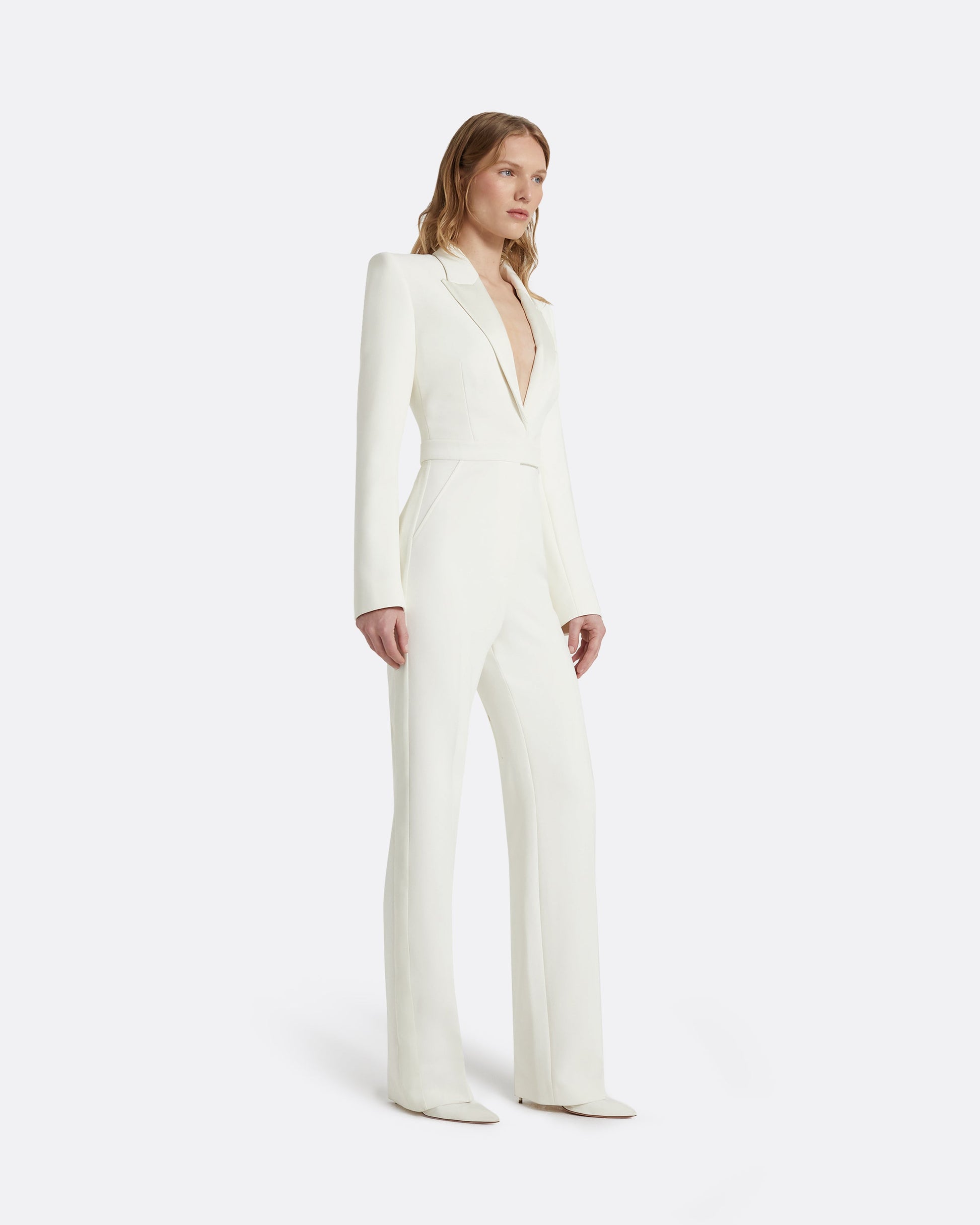 Tuxedo style jumpsuit with tailored shoulders in ivory Heavy Crepe and Satin Back Crepe.
