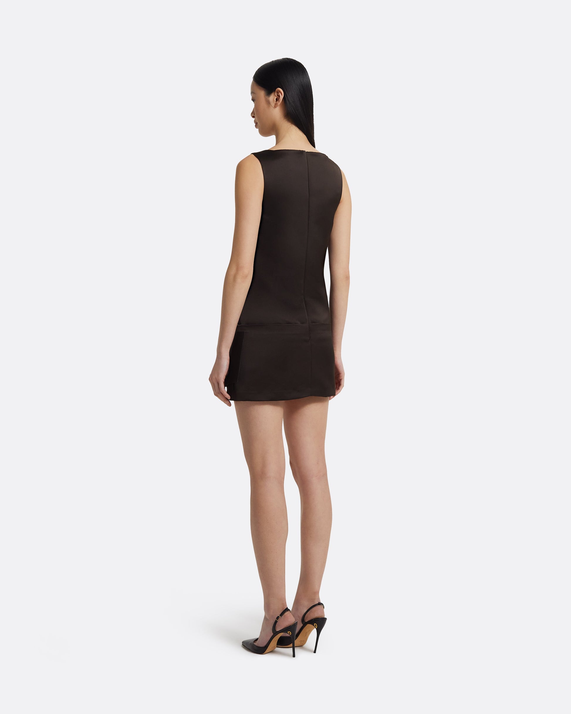 From the Autumn Winter '25 collection, the Kimora dress in peat brown plays with structure and ease. Its foldover front adds sculptural movement to the clean lines of a classic mini shift.