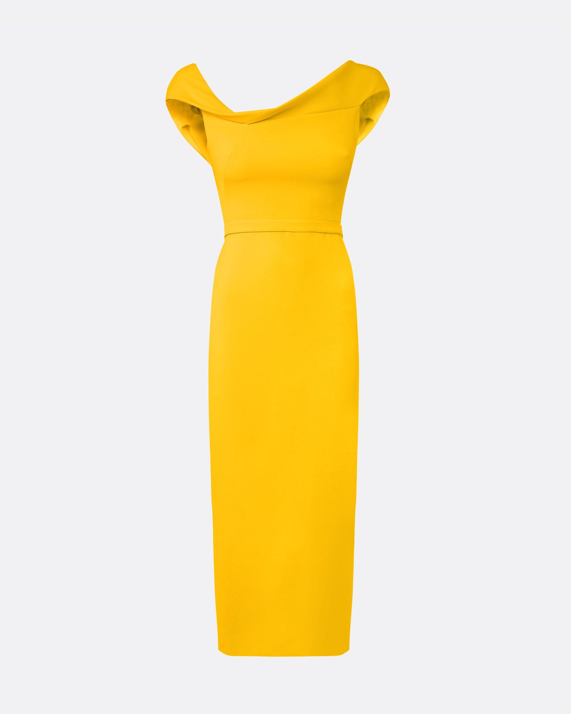 Midi dress with soft draped neckline in sunshine yellow Heavy Crepe.