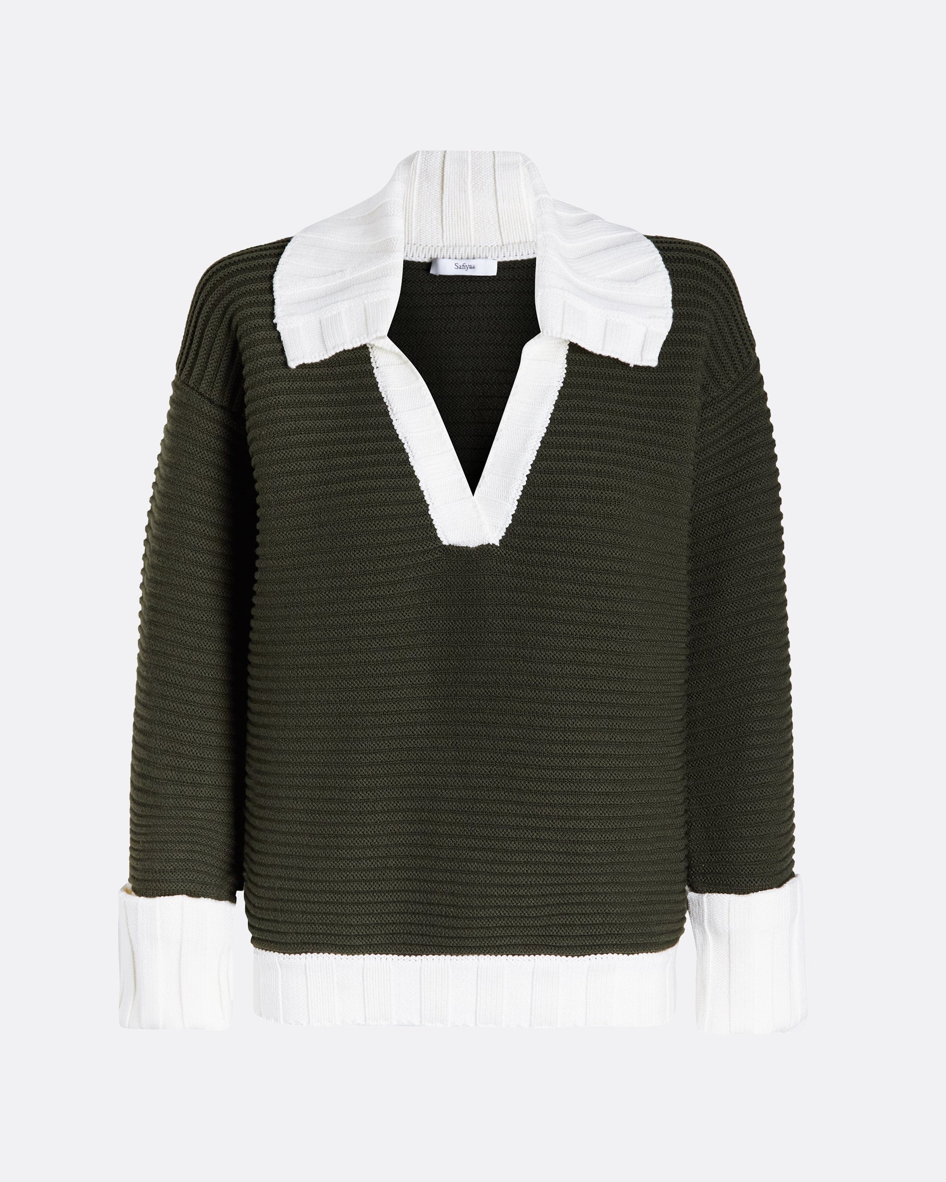 Sweater with open collar, draped sleeve and waistband in ivory and slate green Merino Wool.