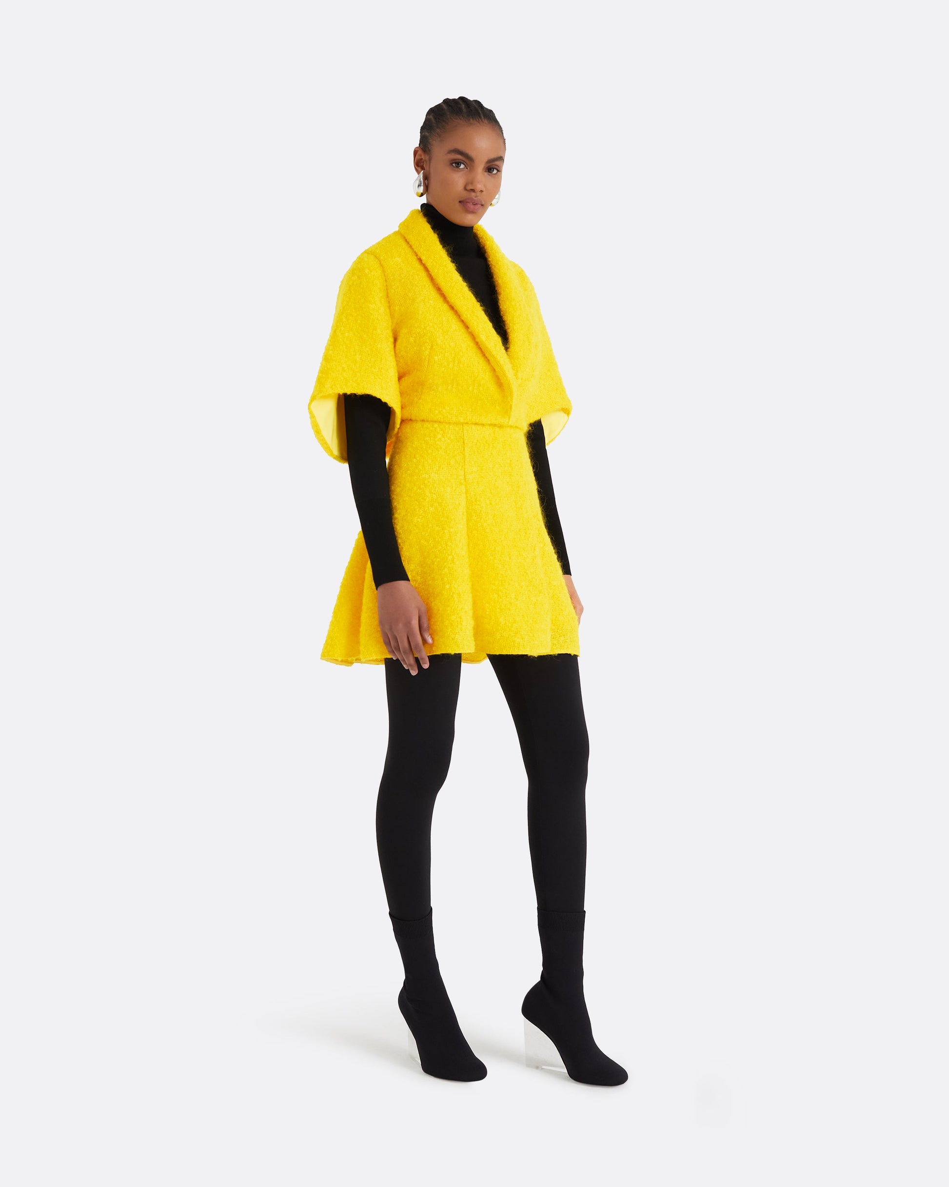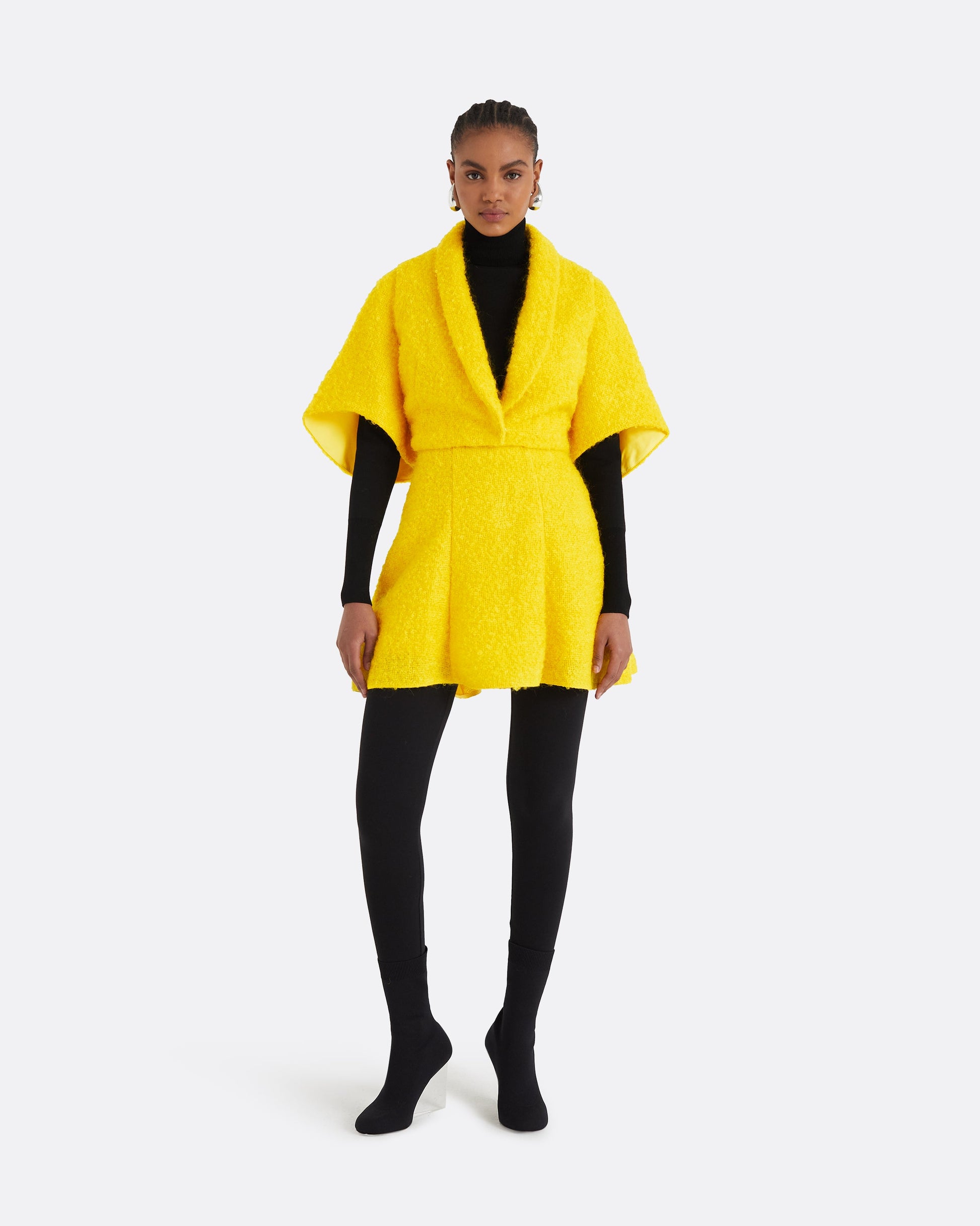 Styled with the Trelan cape in buttercup, and Giulia knit in black.