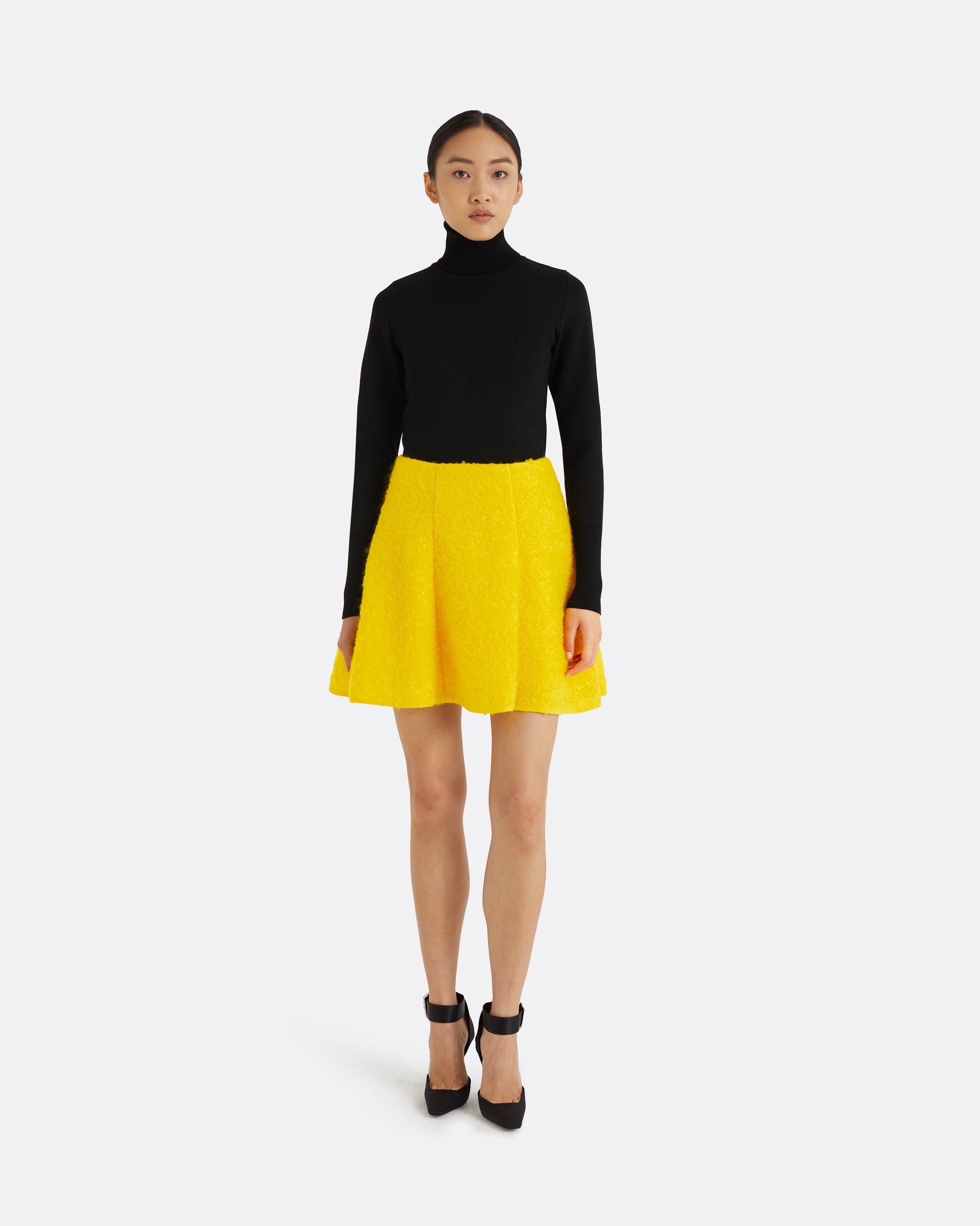 Flared, high waist mini skirt in buttercup Mohair boucle.