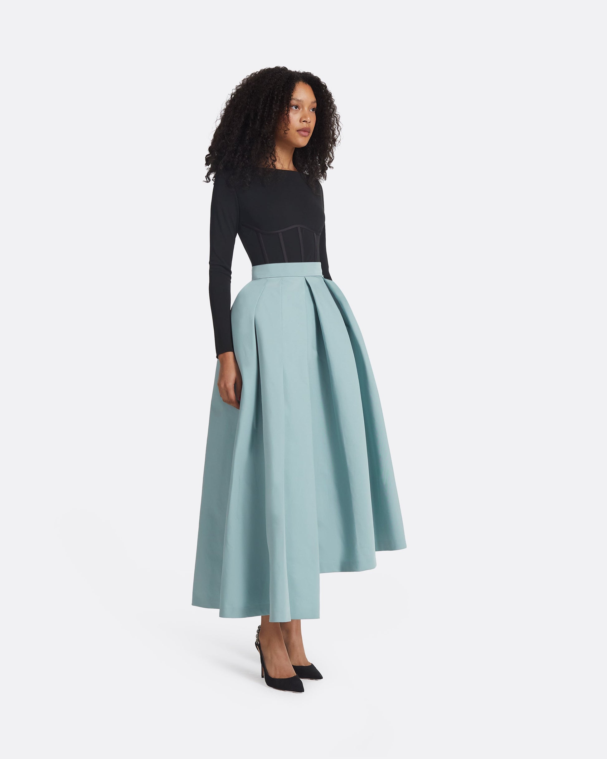 Full skirt with asymmetric hem and pleated detail in spearmint Faille.