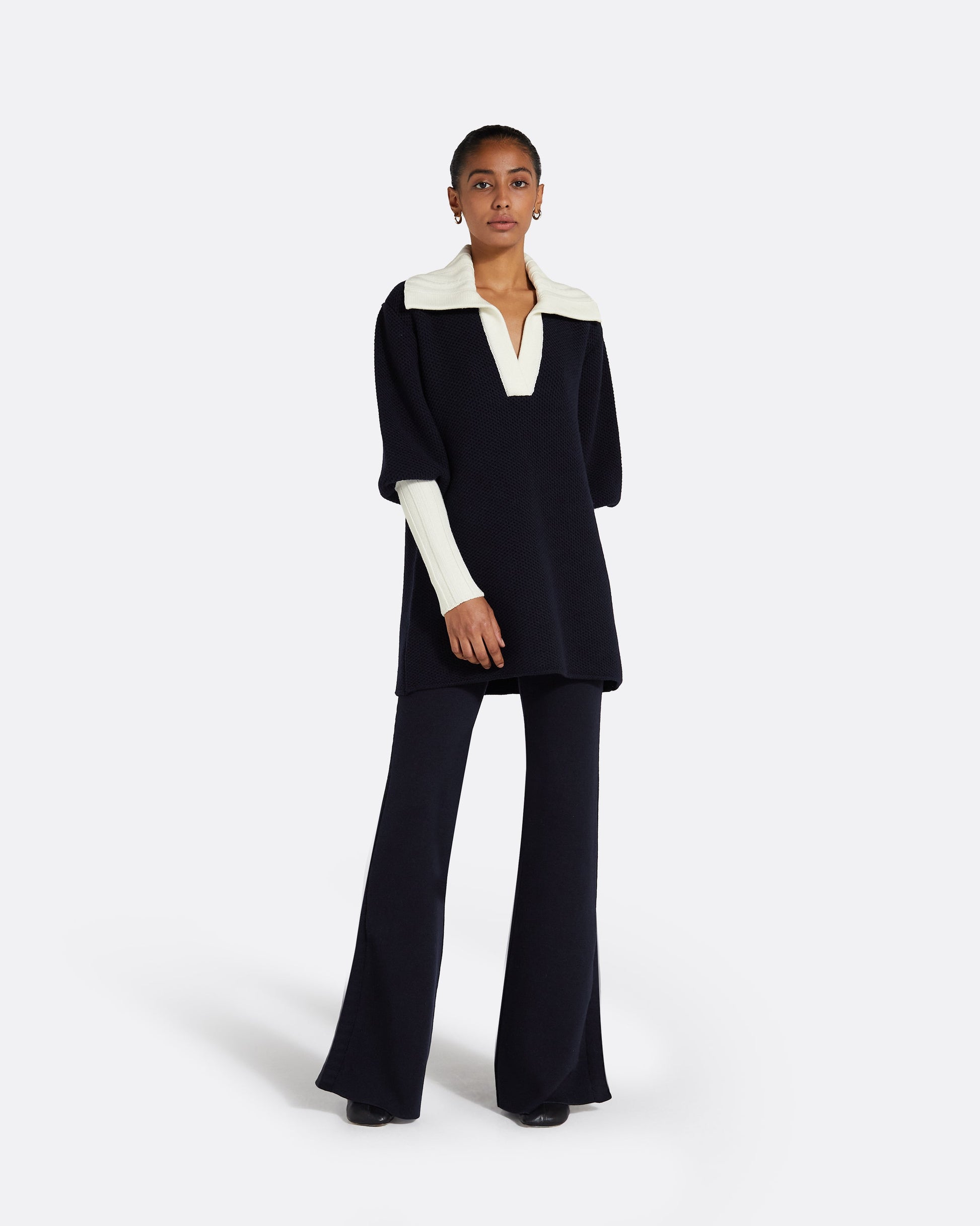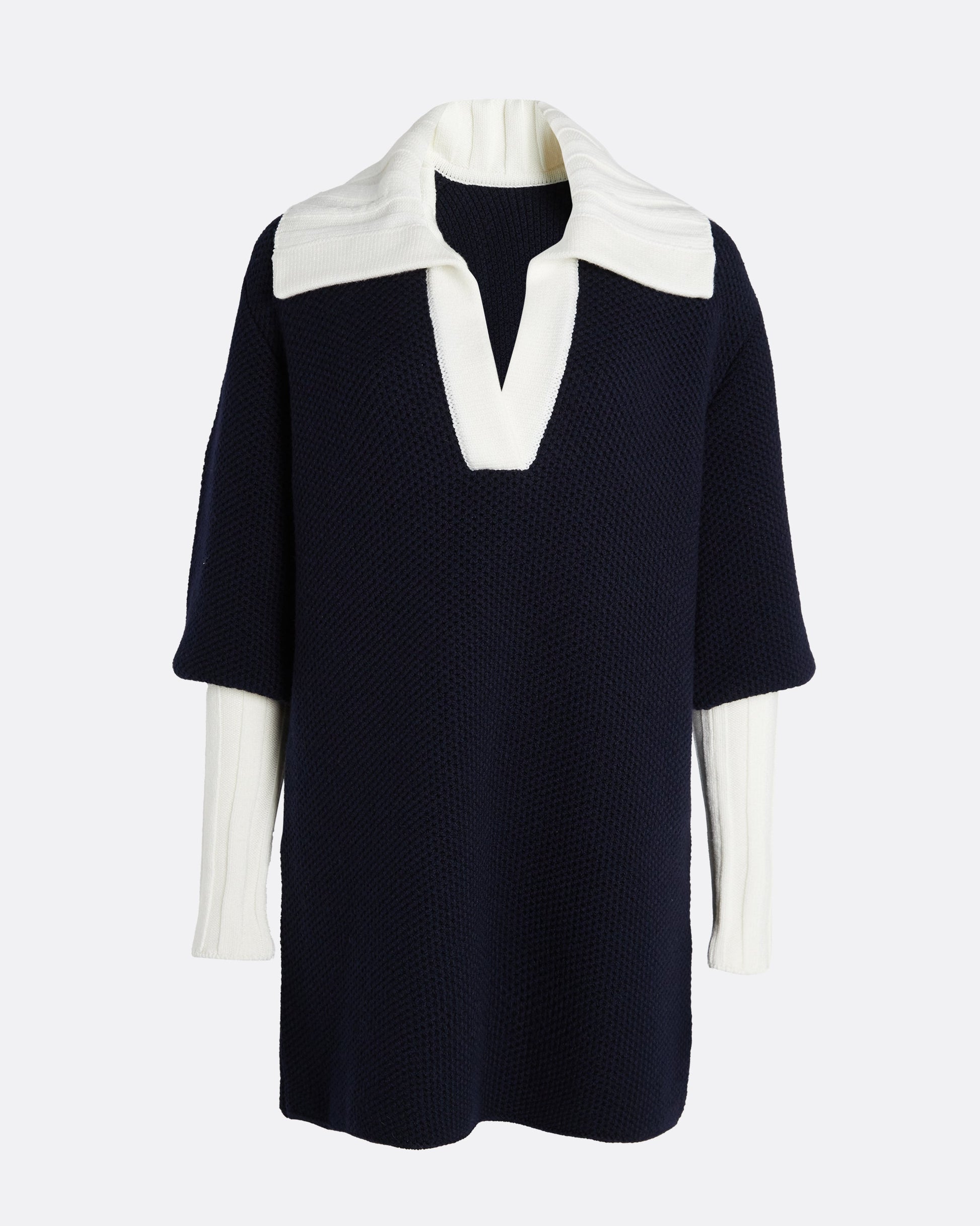 Ribbed foldover collar jumper with honeycomb bodice and cuffed sleeves in navy and ivory.