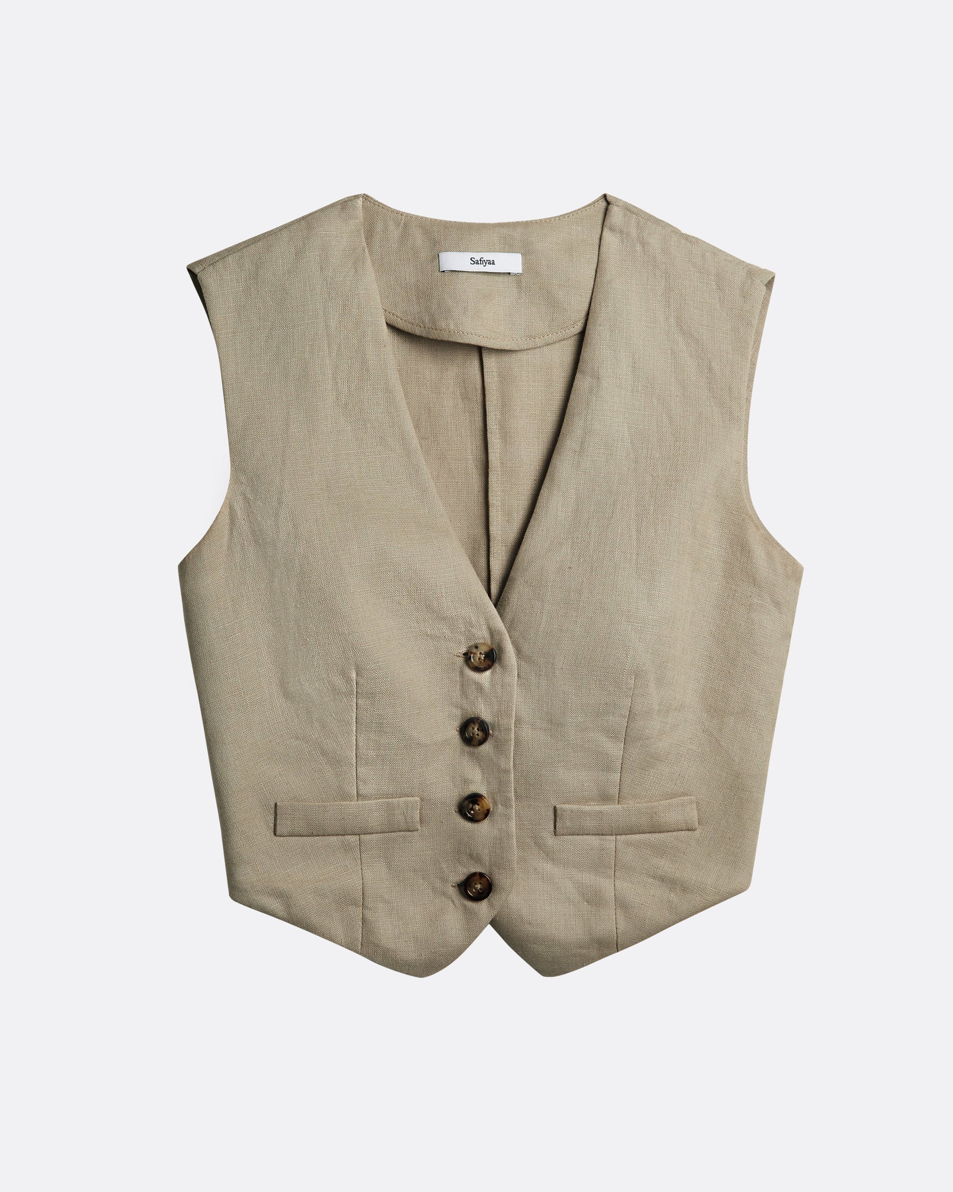 Single breasted, cropped waistcoat in stone Natural Linen.