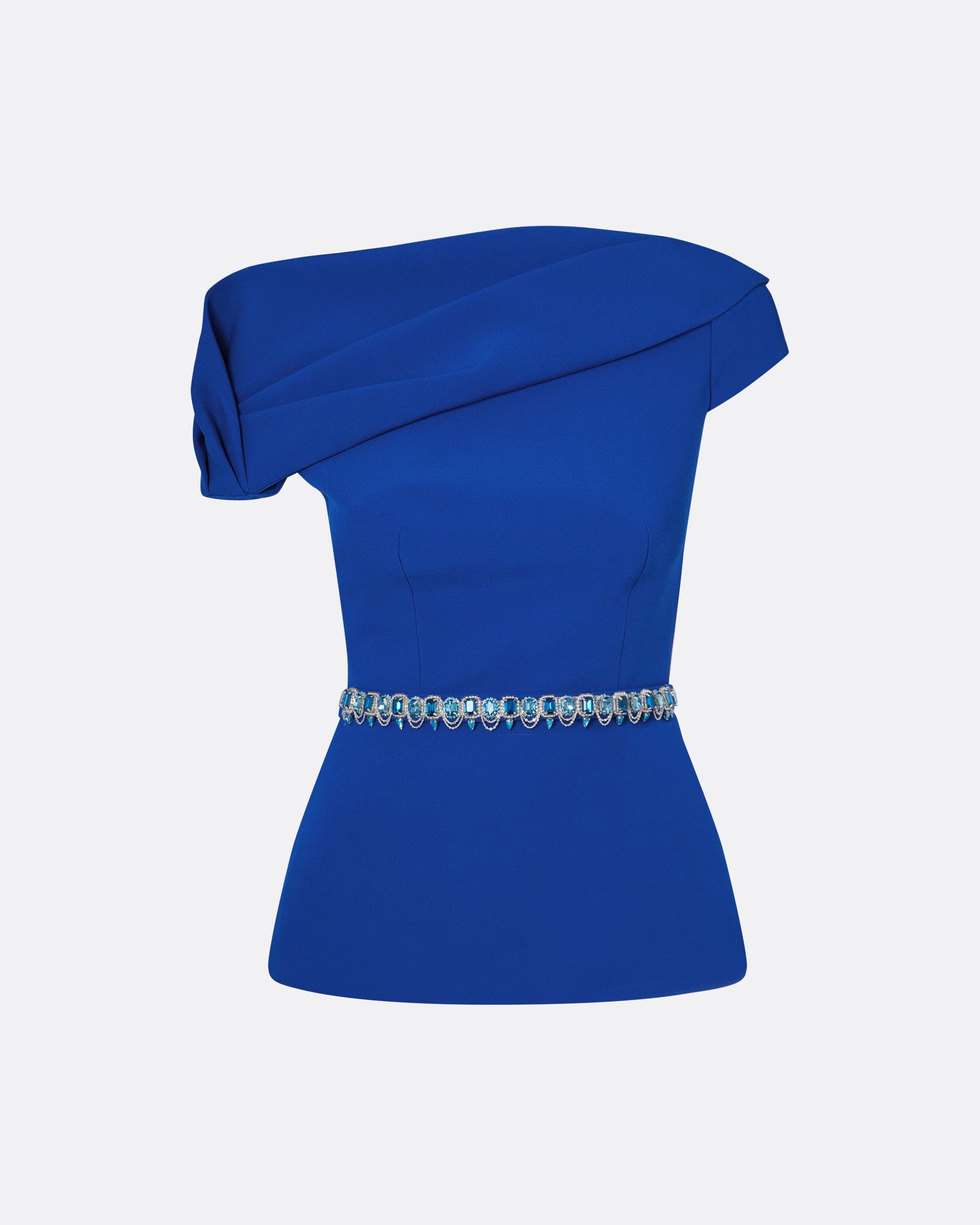 Classic top with peplum and soft draped neckline in marrakech Heavy Crepe with marrakech Adorned Trim Chain embroidery.