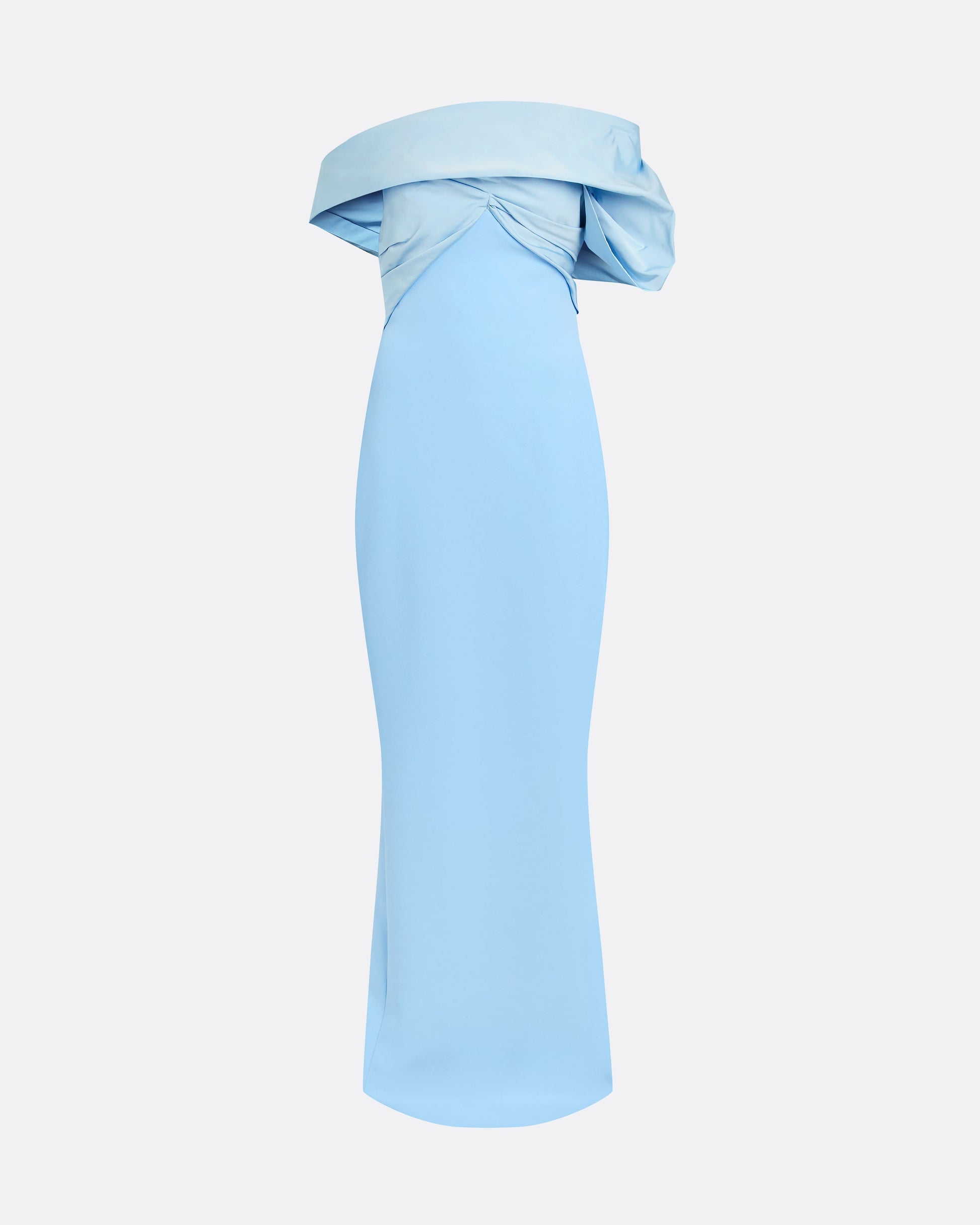 Floor length gown with column skirt and considered, constructed draped neckline in vista Heavy Crepe and Faille.