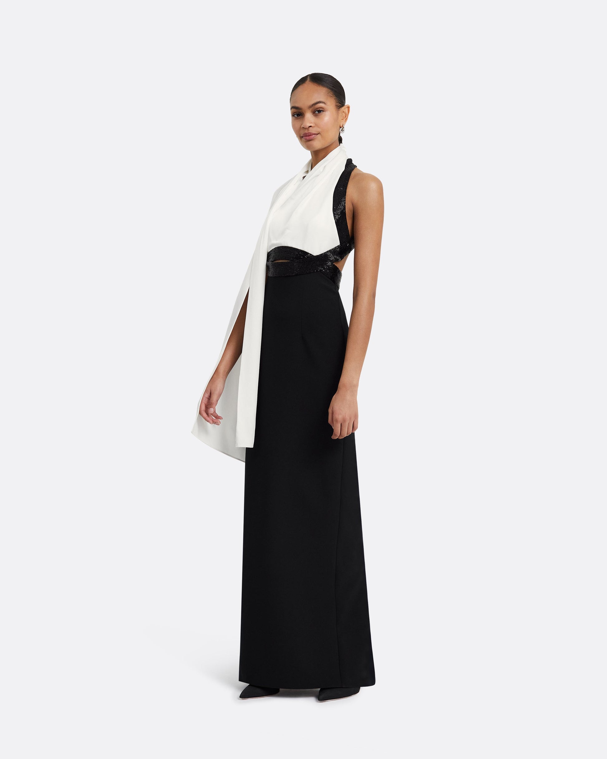 Long dress with shawl draped neckline and waist cutout in black and ivory with black Beaded Fringe Trim embroidery.
