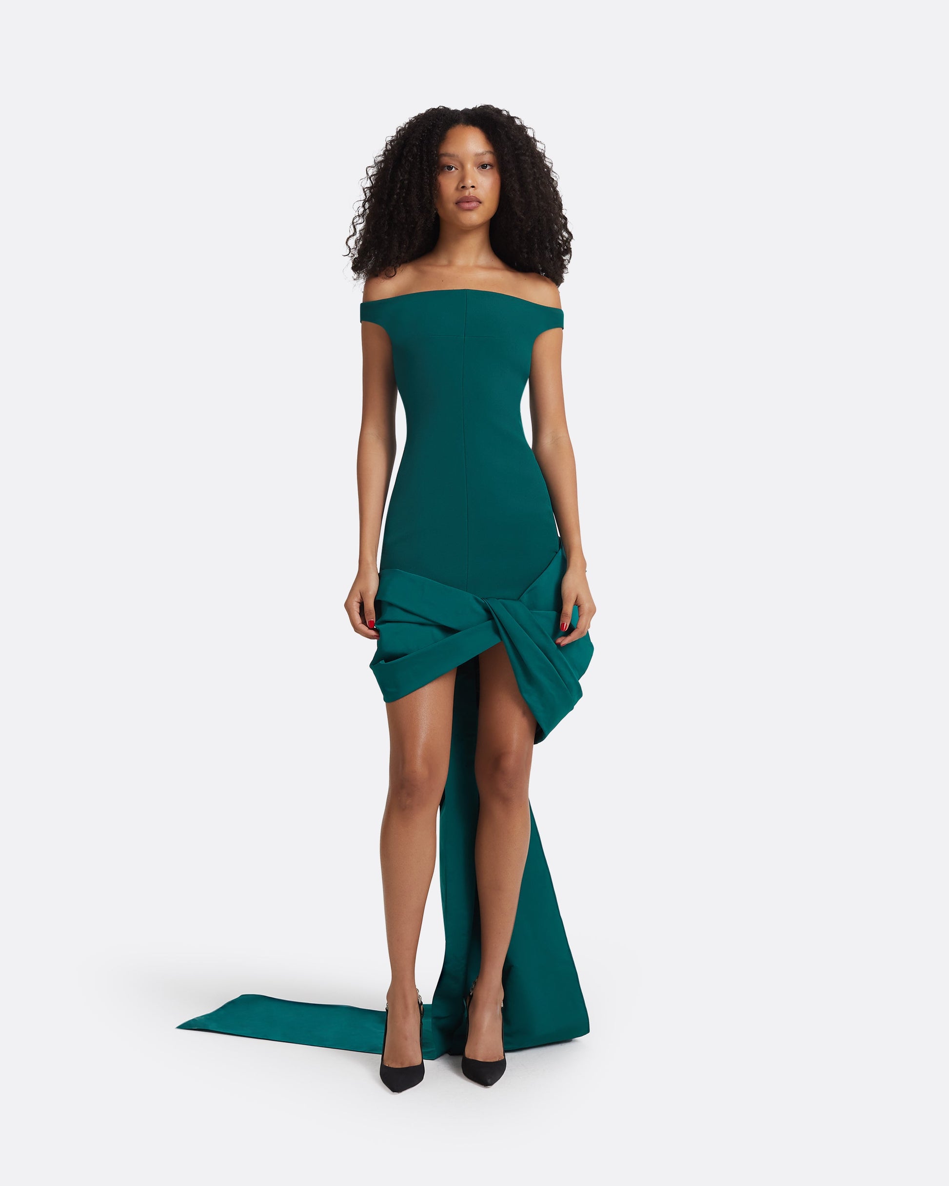 Mini dress with curved neck and bow drape in alpine green Heavy Crepe and Faille.
