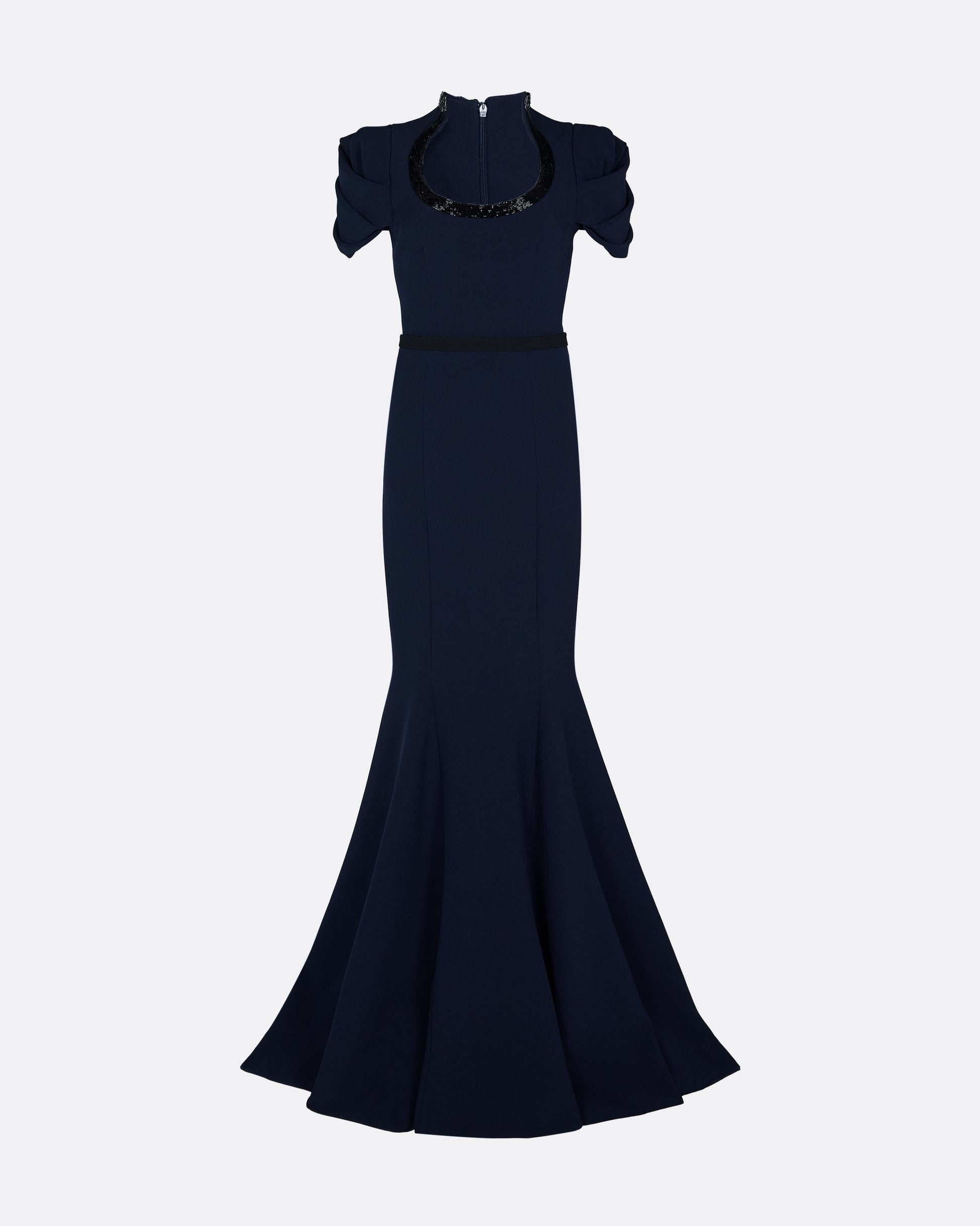 Long dress with scooped neckline with raised back and intertwined sleeve drape in maritime blue with black Beaded Fringe Trim embroidery.