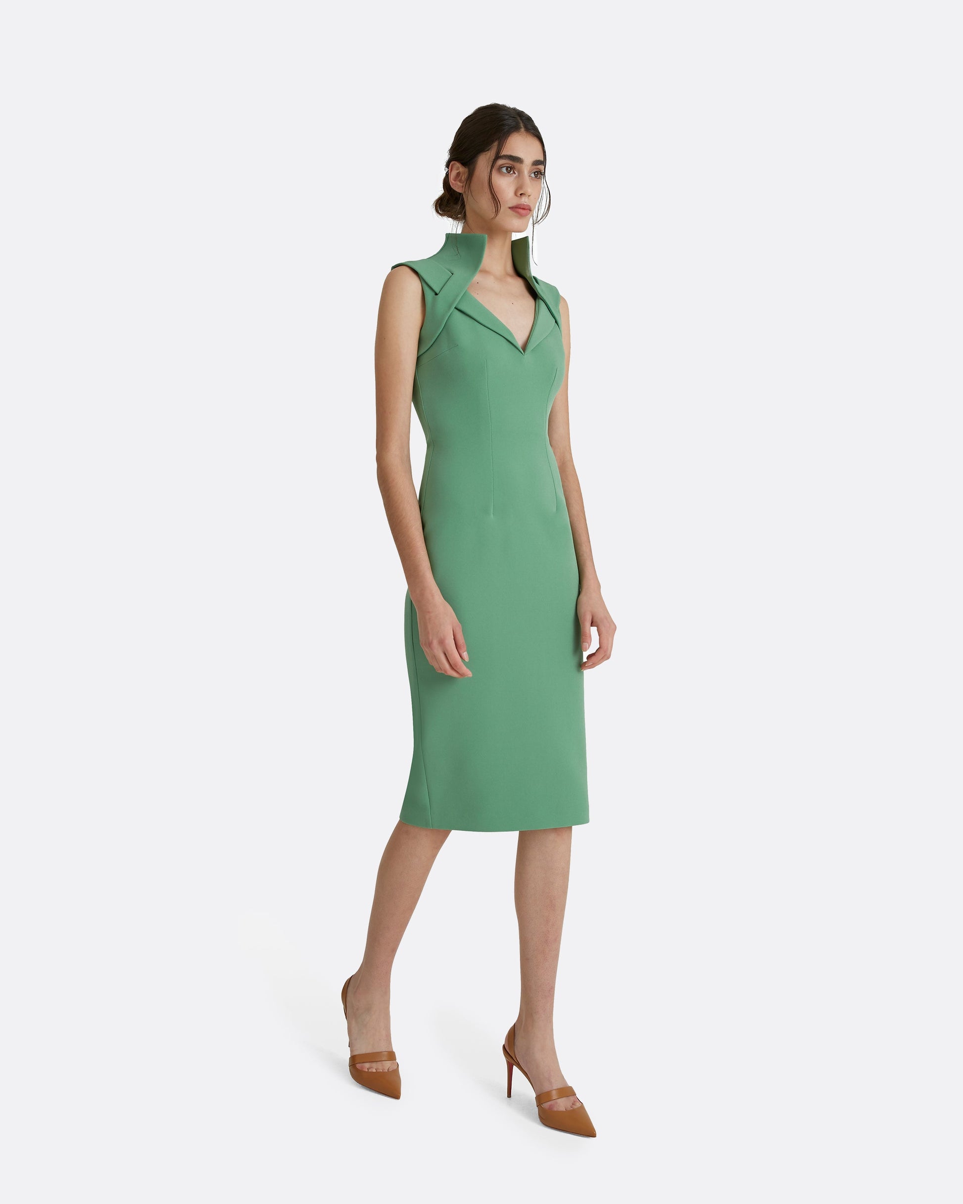 Knee length dress with keyhole neck and slit through detail in fern green.