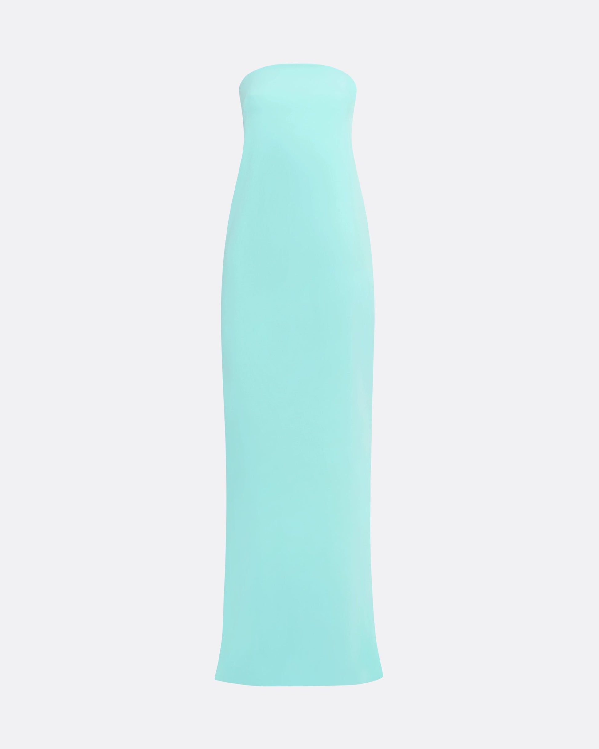 Column gown with flowing back detail and straight neckline in blue danube Satin Back Crepe on positano Heavy Crepe.