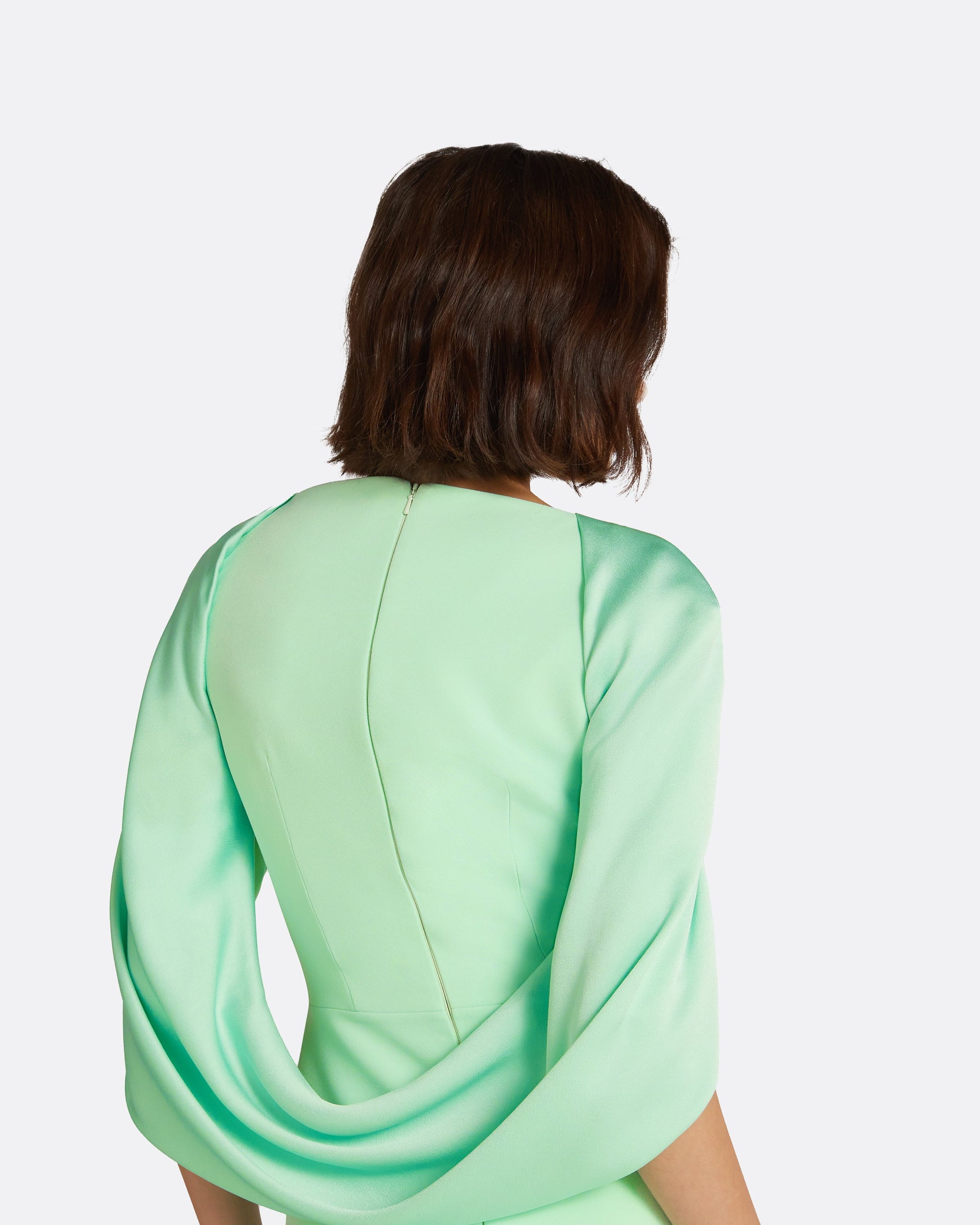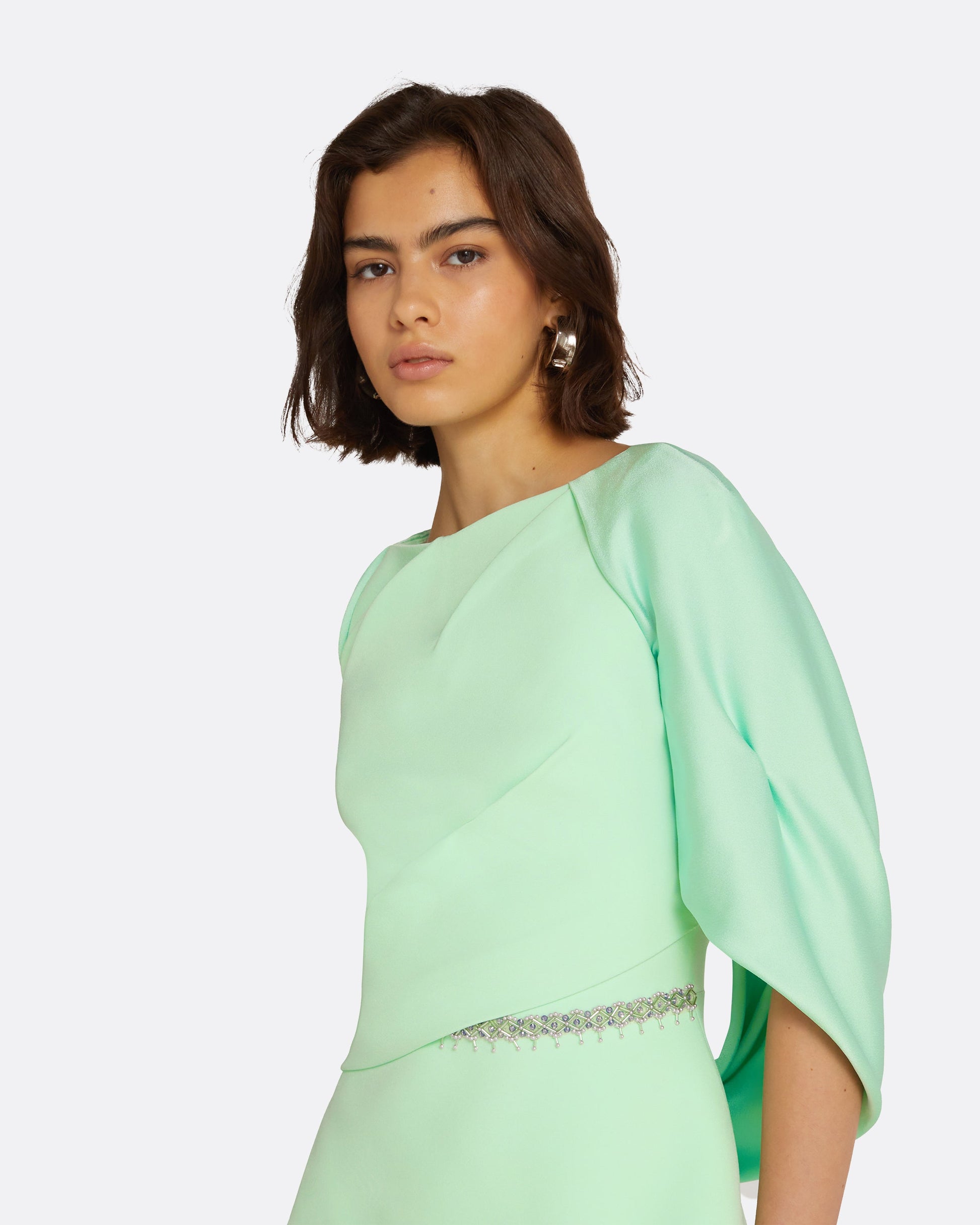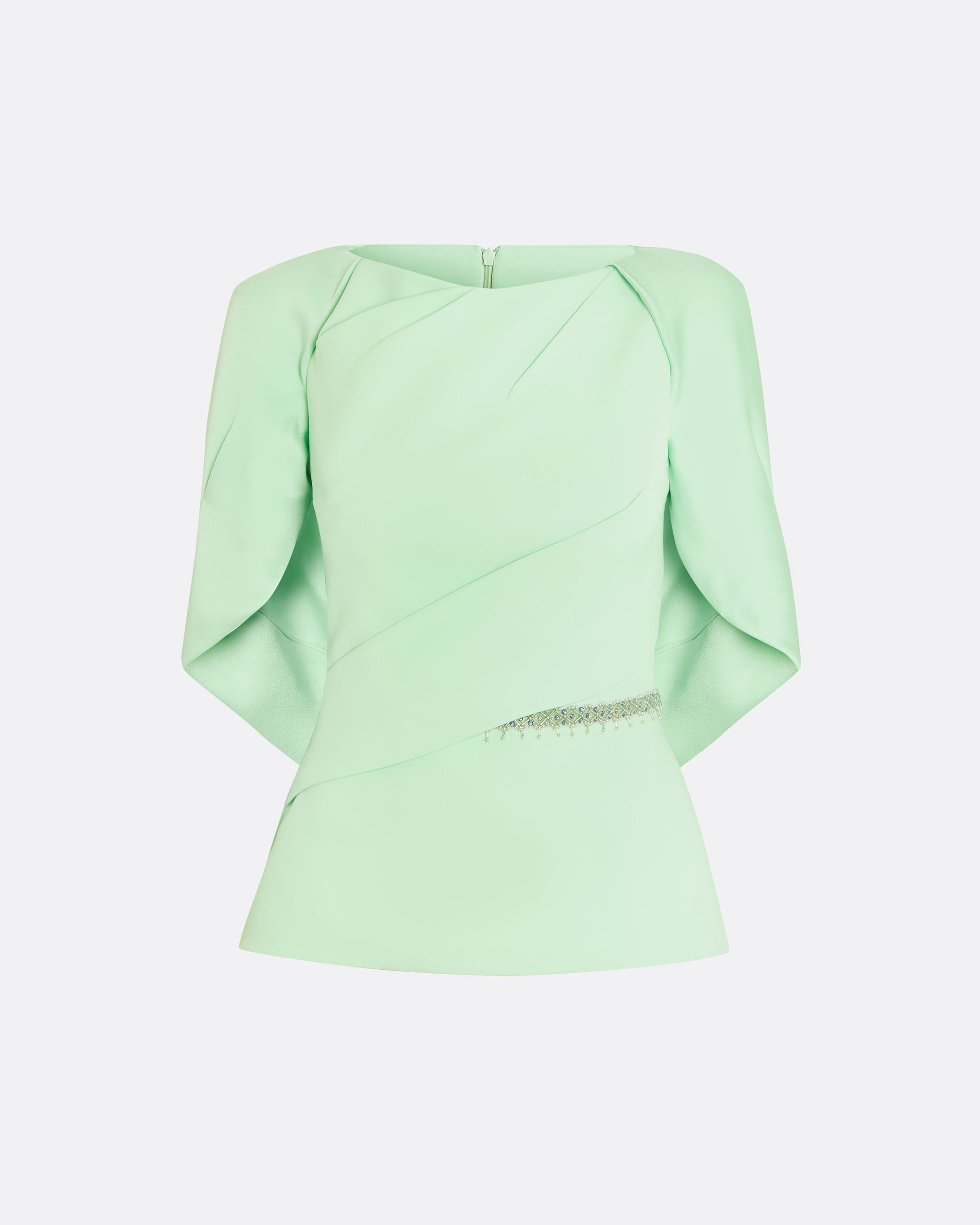 Boatneck top with flattering bodice detail and elegant shoulder drape in brook green Heavy Crepe and Satin Back Crepe, and brook green Geometrica embroidery.